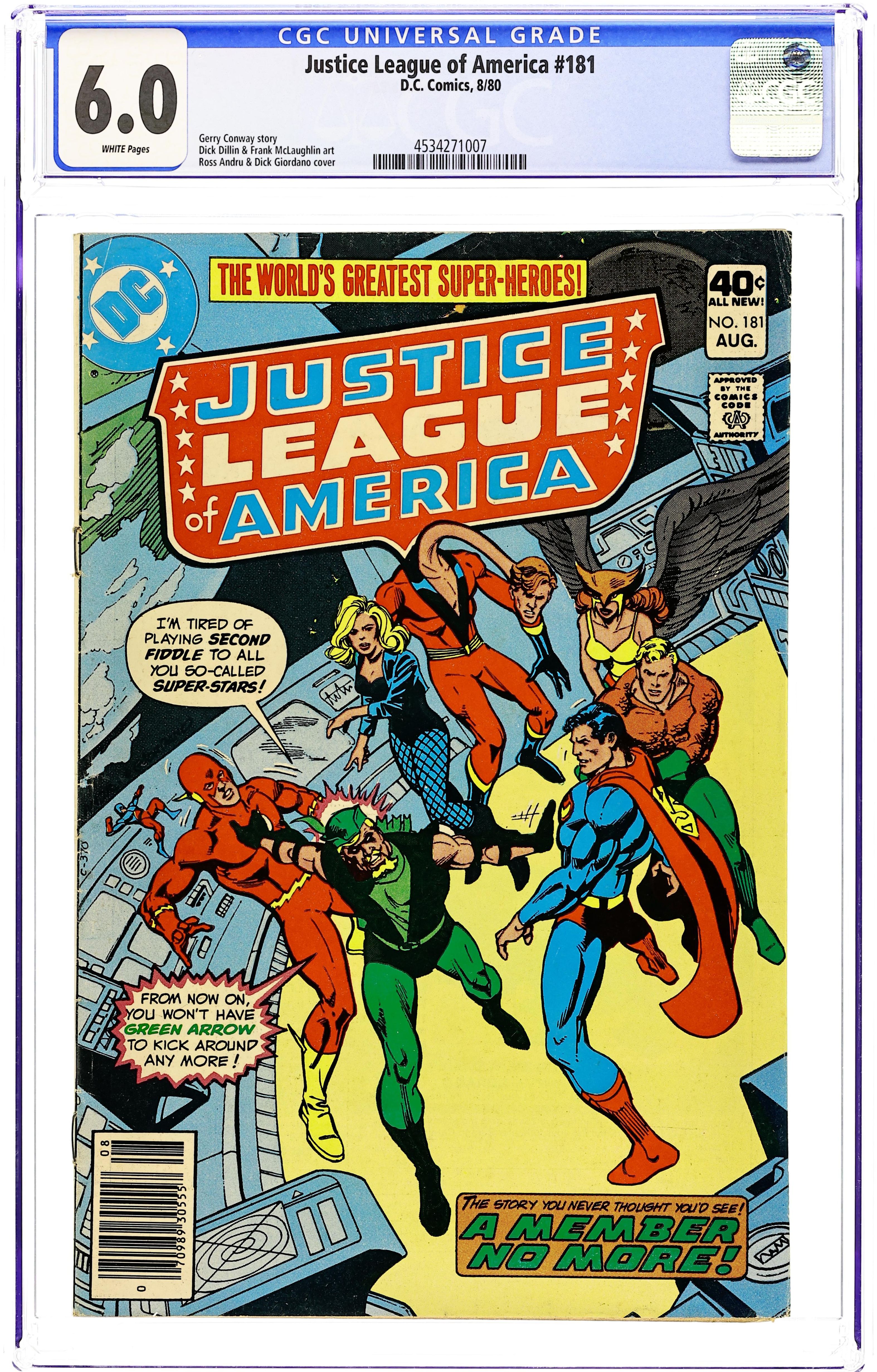 The story you never thought you'd see! A Leaguer is...a member no more! "The Stellar Crimes of the Star-Tsar!" is written by Gerry Conway, with art by Dick Dillin and Frank McLaughlin. Characters: Green Arrow [Earth-1] (quits); Black Canary; Elongated Man; Hawkwoman [Shayera Thal] (as Hawkgirl); Aquaman; Flash [Barry Allen]; Superman [Earth-1]; Atom [Ray Palmer]; Wonder Woman [Earth-1] (flashback) (all as the Justice League of America/JLA); Star-Tsar [Richard Rigel] (villain); Snapper Carr. Cover by Ross Andru and Dick Giordano. Cover price $0.40.