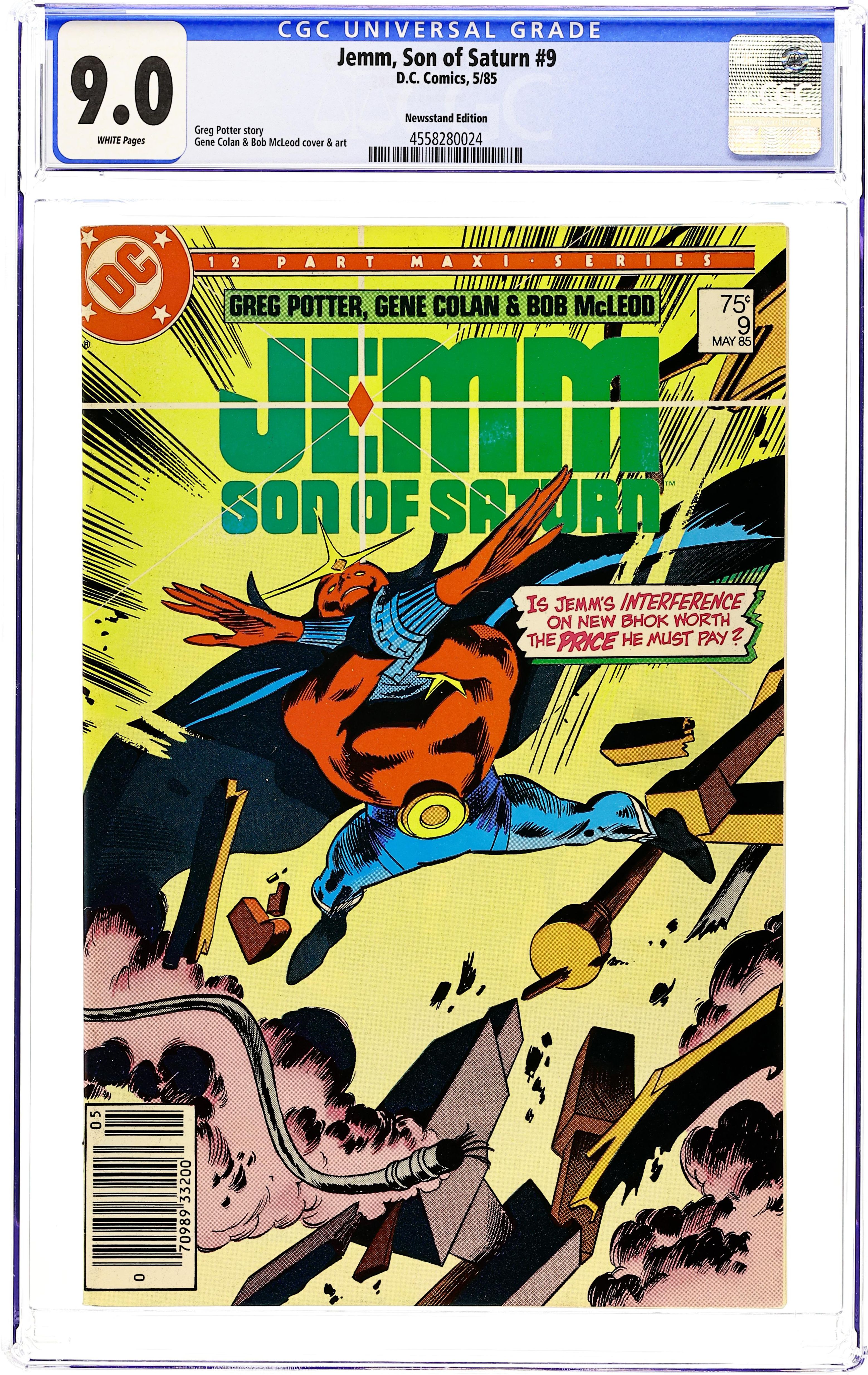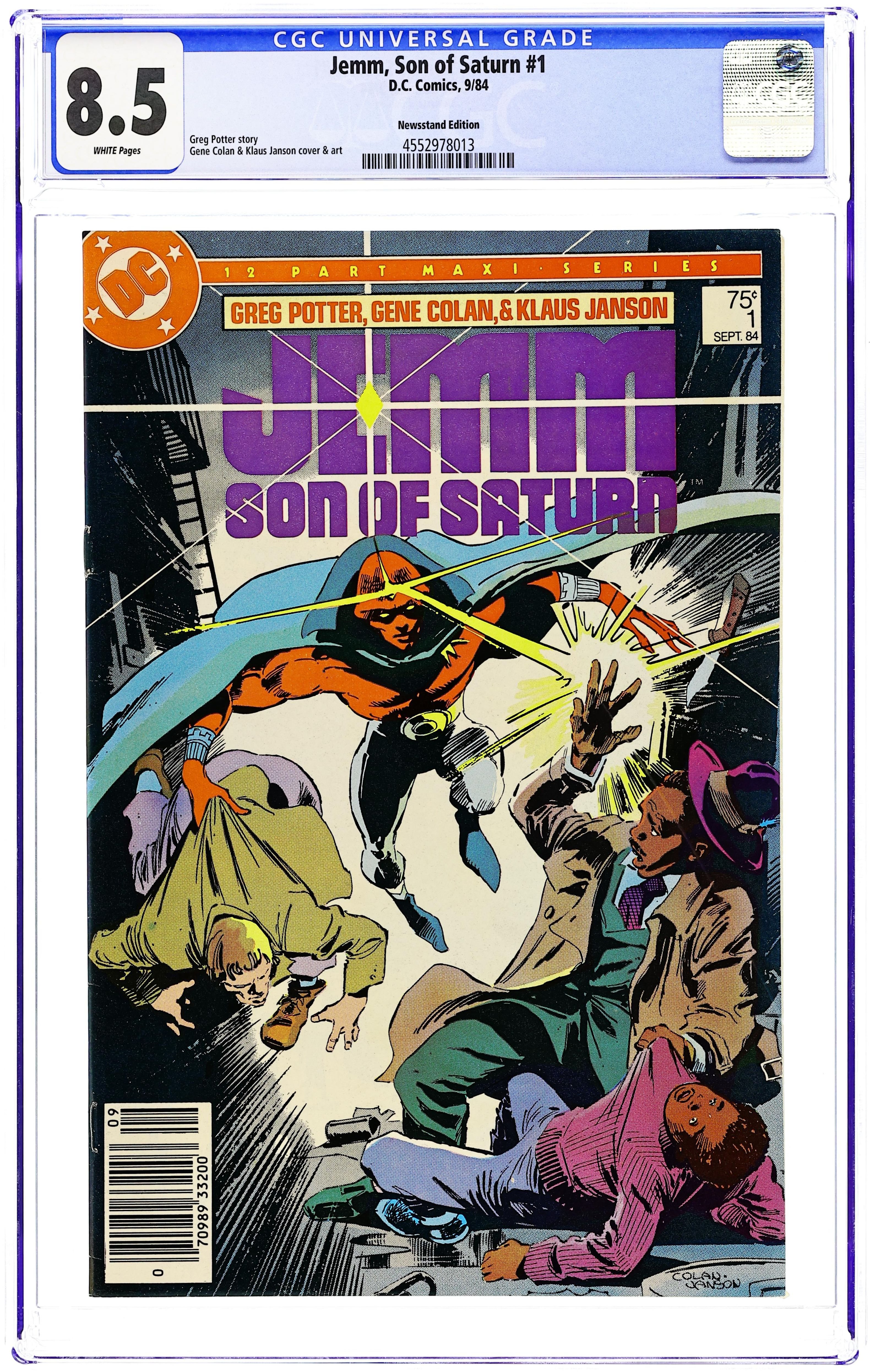 Newsstand Edition. Cover pencils by Gene Colan, inks by Klaus Janson. "The Arrival," script by Greg Potter, pencils by Gene Colan, inks by Klaus Janson; Luther Mannkin discovers Jemm in an alley and takes him home; Luther's brother Lincoln must find a way to pay Cladius Tull the money he owes him or his men will hurt Lincoln and the family; In an attempt to stop Tull's hitmen, Lincoln and his friend Vin start a brawl that ends in the death of Grampa Mannkin; Meanwhile, two NASA scientists and a CIA operative investigate Jemm's crashed ship and are attacked by RT-36258 and other aliens. All-Star Squadron ad. Janice Rand talks about the creation of the Jemm, Son of Saturn series. New Teen Titans ad. 36 pgs., full color. $0.75. Cover price $0.75.