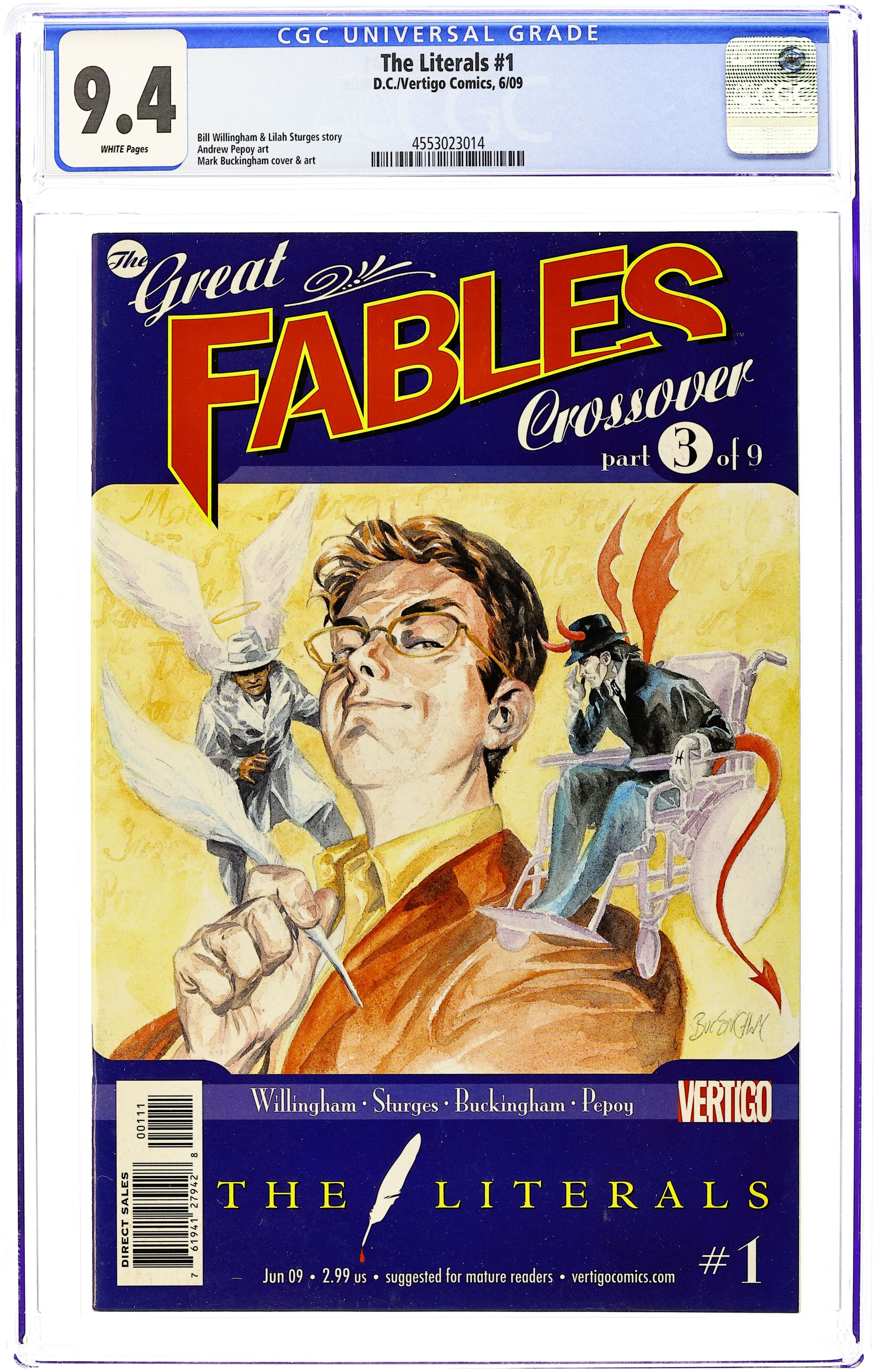 The Great Fables Crossover: Part 3 of 9 - Written by Bill Willingham & Matthew Sturges Art by Mark Buckingham & Andrew Pepoy Cover by Mark Buckingham. If you're a reader of JACK OF FABLES, then you're familiar with The Literals - an extended family of characters who literally embody literary notions. It's also very possible that one of The Literals may have created all of the Fables plus the universe in which they reside, unbeknownst to our beloved Fables. The full story on this enigmatic crew of characters begins here, the first in a 3-issue miniseries and Part 3 of 'The Great Fables Crossover,' an epic, 9-part tale spanning the pages of FABLES and JACK OF FABLES. The story kicks off when Jack reveals the existence of The Literals to Fabletown, and things quickly get chaotic from there. Fables don't like the idea of having a living god who can wipe them out with the stroke of a pen, and have thus decided to get rid of The Literals. Will they succeed in erasing their creator from existence, or will he literally rub them out first? 32 pages, full color. MATURE READERS Cover price $2.99.