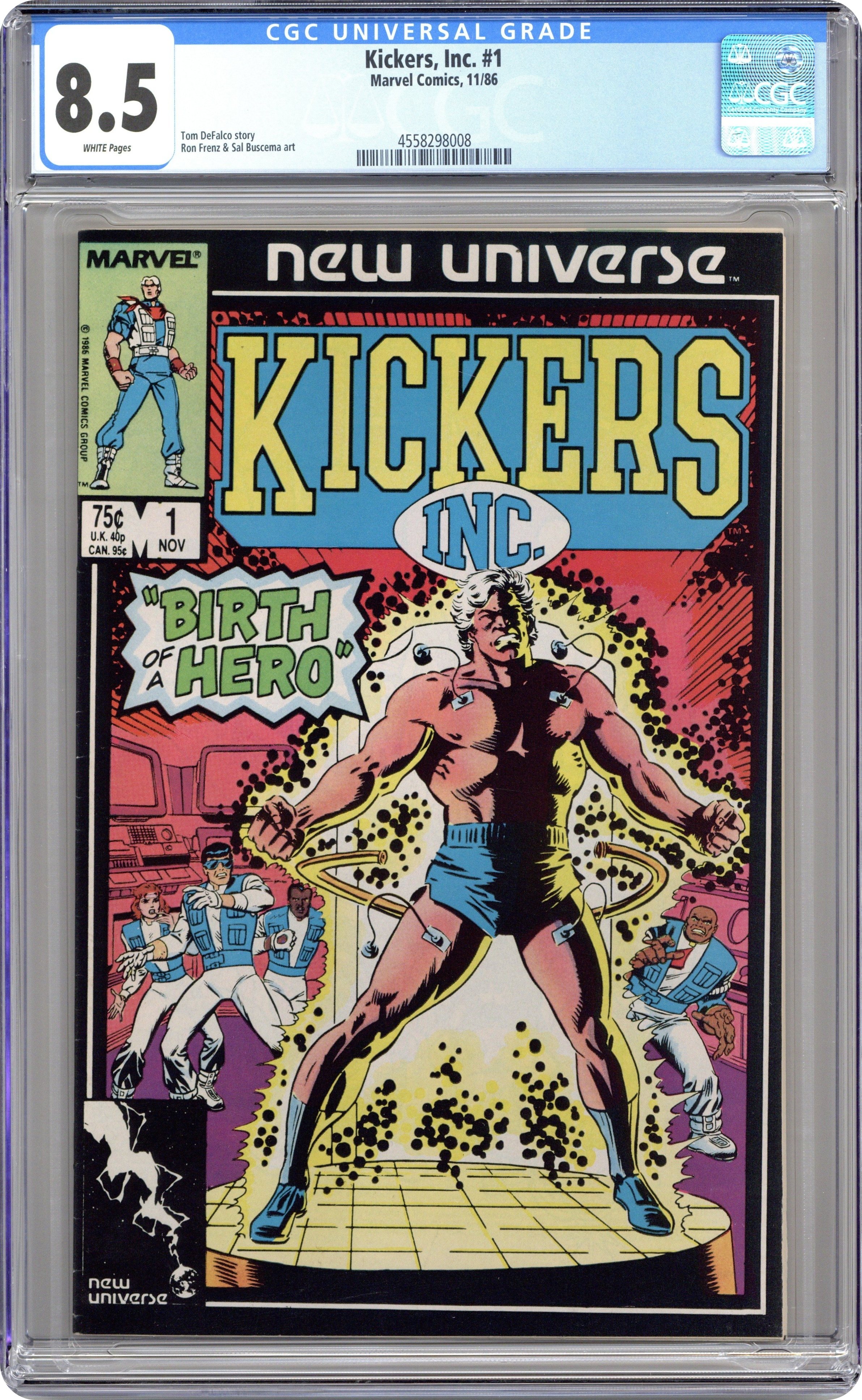 Direct Edition. "This Legend Born!" Story by Tom DeFalco. Art by Ron Frenz and Sal Buscema. It's a world not unlike our own. Words like paranormal or super-hero are euphemisms only used in comic books and movies. That was until the White Event! In one blinding moment the landscape of the universe changed. Welcome to the New Universe. Jack Magniconte is one of the greatest professional football players to ever play the game. The fans call him "Mr. Magnificent!" However, after the White Event, Jack develops physical abilities far beyond those of normal men. He forms a team of trusted friends and top operatives, and Kickers, Inc., the worlds premier paranormal investigators, is born! Cover price $0.75.