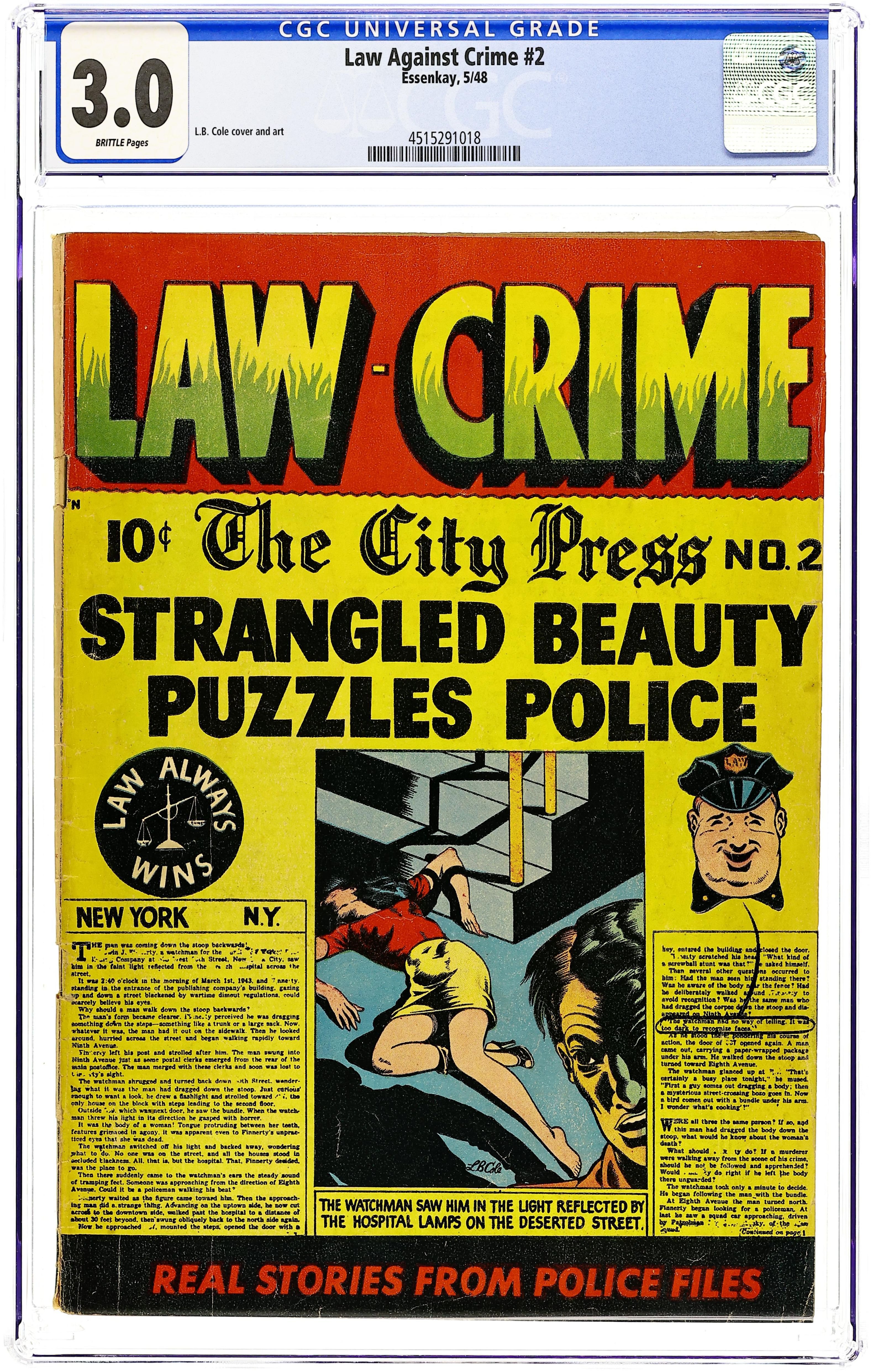 Cover art by Stan Campbell. "Law Breakers Suspense Story," art by Lou Morales; A short whodunit for the reader to solve. "Getting A-Head," art by Dennis Laugen; A man commits a murder but his dog keeps digging up the corpse. "D as in Death," pencils by Lou Morales, inks by Dennis Laugen; A man plots to kill his wife and his friend. "Two Minds as One" text story. "Yesterday's Murder," art by Stan Campbell; An old murder case is reviewed. "The Voice from the Deep!", art by Lou Morales; A man plots to kill his wife for the insurance money. "Death by Lantern Light," art by Frank Frollo; An engagement is cut short by death. "The Devil's Gun," art by Lou Morales; One gun is used in seven different murders. 36 pgs., full color. Cover price $0.10.