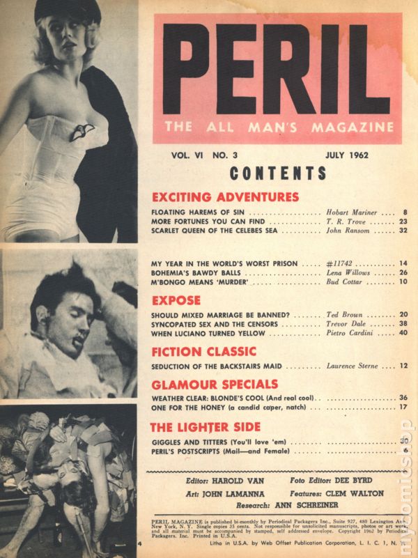 July 1962. Men's magazine with fiction, cartoons and pictorials. 8-in. x 10 3/4-in., 66 pages, B&W and partial color. Mature readers. Cover price $0.50.