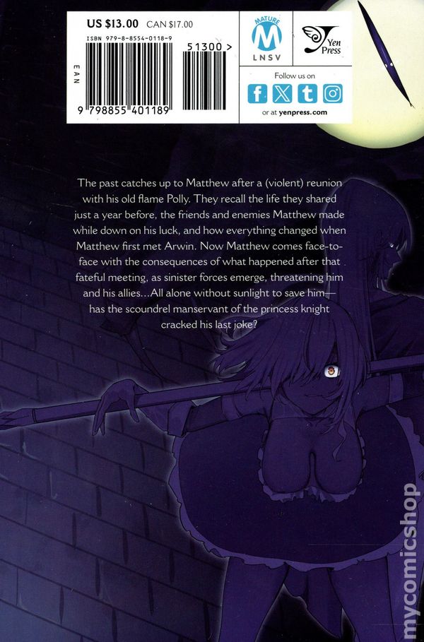 Volume 2 - 1st printing. Written by Toru Shirogane. Art and cover by Keyyang. Translated by Stephen Paul. The past catches up with Matthew when he's (violently) reunited with an old lover, Polly, leading him to recall the last few years. Being stripped of his power by the sun god, the friends and enemies he made while down on his luck, and his first encounter with Arwen. As we learn more about the scoundrel manservant of the princess knight, could it reveal a previously unseen side of his character..? Softcover, 5-in. x 7-in., 192 pages, B&W. Mature Readers Cover price $13.00.