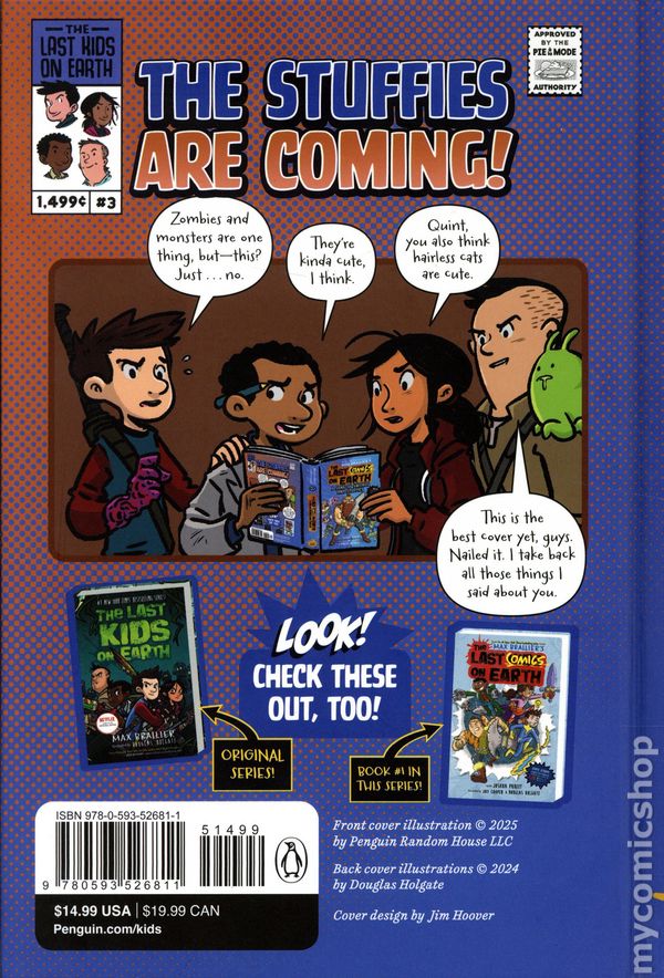 Volume 3 - 1st printing. "A Song of Swords and Stuffies!" Written by Max Brallier and Joshua Pruett. Art by Doug Holgate and Jay Cooper. Cover by Penguin Random House LLC. Back Cover by Doug Holgate. After one-upping themselves with a triumphant follow-up to their bestselling comic book, the Last Kids on Earth are met with unexpected competition: Skaelka has written her own comic and it's selling like hotcakes! Determined to reclaim their #1 spot, our heroes get to work to create the ultimate threequel... When a vicious monster attacks Apocalyptia, a group of adorably fluffy and delightfully stinkin' cute mascot-shaped heroes arrive on the scene to help: the Laser Blade Hero Squad! Forming an alliance with our heroes, they agree to look after Apocalyptia while the Savage Aloner is called home on a mission to save his people from a mysterious threat. The entire land, and its citizens, have been... cutified! Now it's up to Savage and our heroes to get to the bottom of things, before Barbarious Fantastica, and the rest of Apocalyptia, becomes permanently adorable! Hardcover, 6-in. x 8-in., 256 pages, full color. Cover price $14.99.
