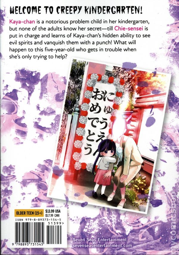 Volume 1 - 1st printing. Story and art by YURITARO. Translated by Kathryn Henzier. Are you braver than a kindergartner? Find out with this horror manga that takes place in the most unlikely of places-and don't miss the upcoming anime!Kaya-chan is a notorious problem child in her kindergarten, but none of the adults know her secret--till Chie-sensei is put in charge and learns of Kaya-chan's hidden ability to see evil spirits and vanquish them with a punch! What will happen to this five-year-old who gets in trouble when she's only trying to help? Softcover, 5-in. x 7-in., 168 pages, B&W. Older Teen (15+) Cover price $13.99.