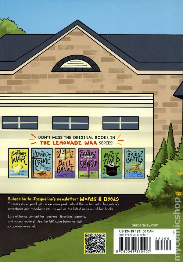1st printing. Written by Jacqueline Davies. Art and cover by Karen De La Vega. The first book in the beloved Lemonade War series - a clever blend of humor, math wizardry, and business know-how - has sold more than 1.5 million copies and is now available as a full-color graphic novel! Evan Treski is people smart. He's good at talking to people, even grown-ups. His younger sister, Jessie, on the other hand, is math smart - but not especially good at understanding people. She knows that feelings are her weakest subject. With just five days left of summer vacation, Evan and Jessie launch an all-out war to see who can sell the most lemonade before school starts. As the battleground heats up, there really is no telling who will win - and, even more important, if their fight will ever end. Hardcover, 6-in. x 8 1/2-in., 208 pages, full color. Cover price $24.99.
