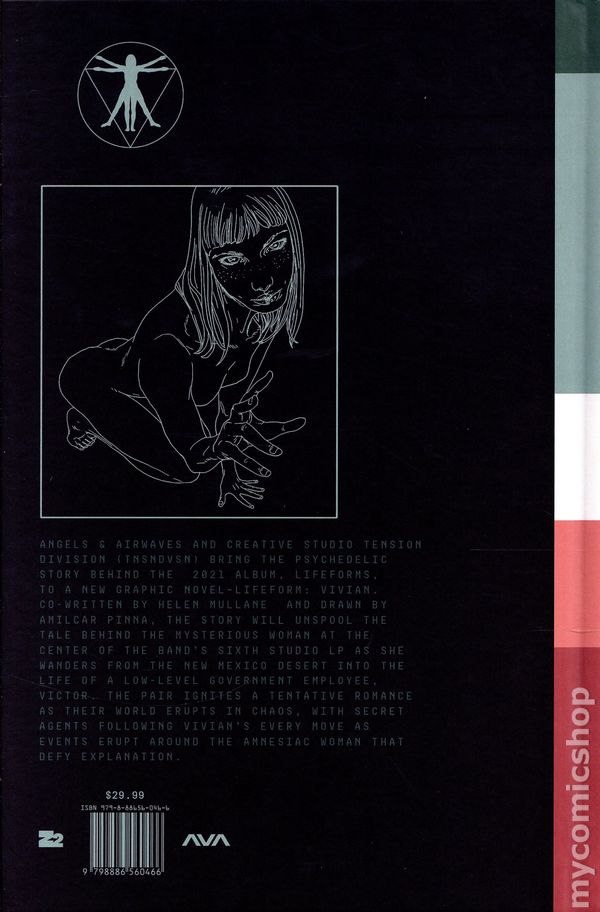 1st printing. Written by Helen Mullane. Art by Amilcar Pinna. Cover by Brandon Rike and Amilcar Pinna. ANGELS & AIRWAVES and creative studio Tension Division bring the psychedelic story behind the 2021 album, Lifeforms, to a new graphic novel — Lifeform: Vivian. Co-written by Helen Mullane (Superstate, Nicnevin and the Bloody Queen) and drawn by Amilcar Pinna (Tori Amos: Little Earthquakes, Eternal Blue: A Spiritbox Graphic Novel), the story will unspool the tale behind the mysterious woman at the center of the bands sixth studio LP as she wanders from the New Mexico desert into the life of a low-level government employee, Victor. The pair ignites a tentative romance as their world erupts in chaos, with secret agents following Vivians every move as events erupt around the amnesiac woman that defy explanation. Hardcover, 120 pages, full color. Cover price $29.99.