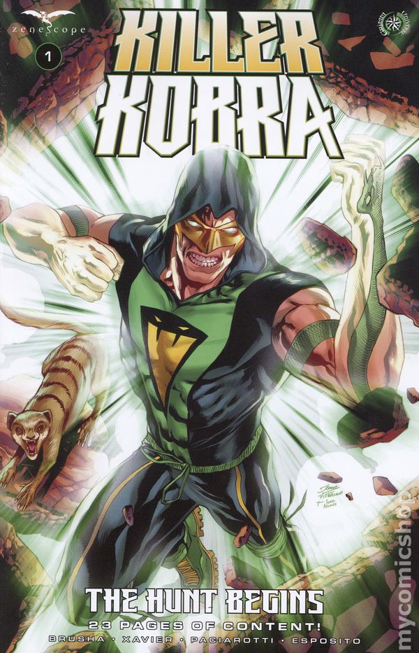 Written by Joe Brusha. Art by Rodrigo Xavier. Cover by Igor Vitorino. The newest and deadliest force in the Zenescope universe has arrived! Killer Kobra, a shadowy vigilante who strikes with the fury of a thousand venoms, is on a mission to rid the world of evil-one monster at a time. With his mastery of the Cobra style of kung fu and his lethal touch, nothing...including the elusive cryptid Bigfoot... will stand in his way. 32 pages, full color. Rated T. Cover price $4.99.