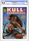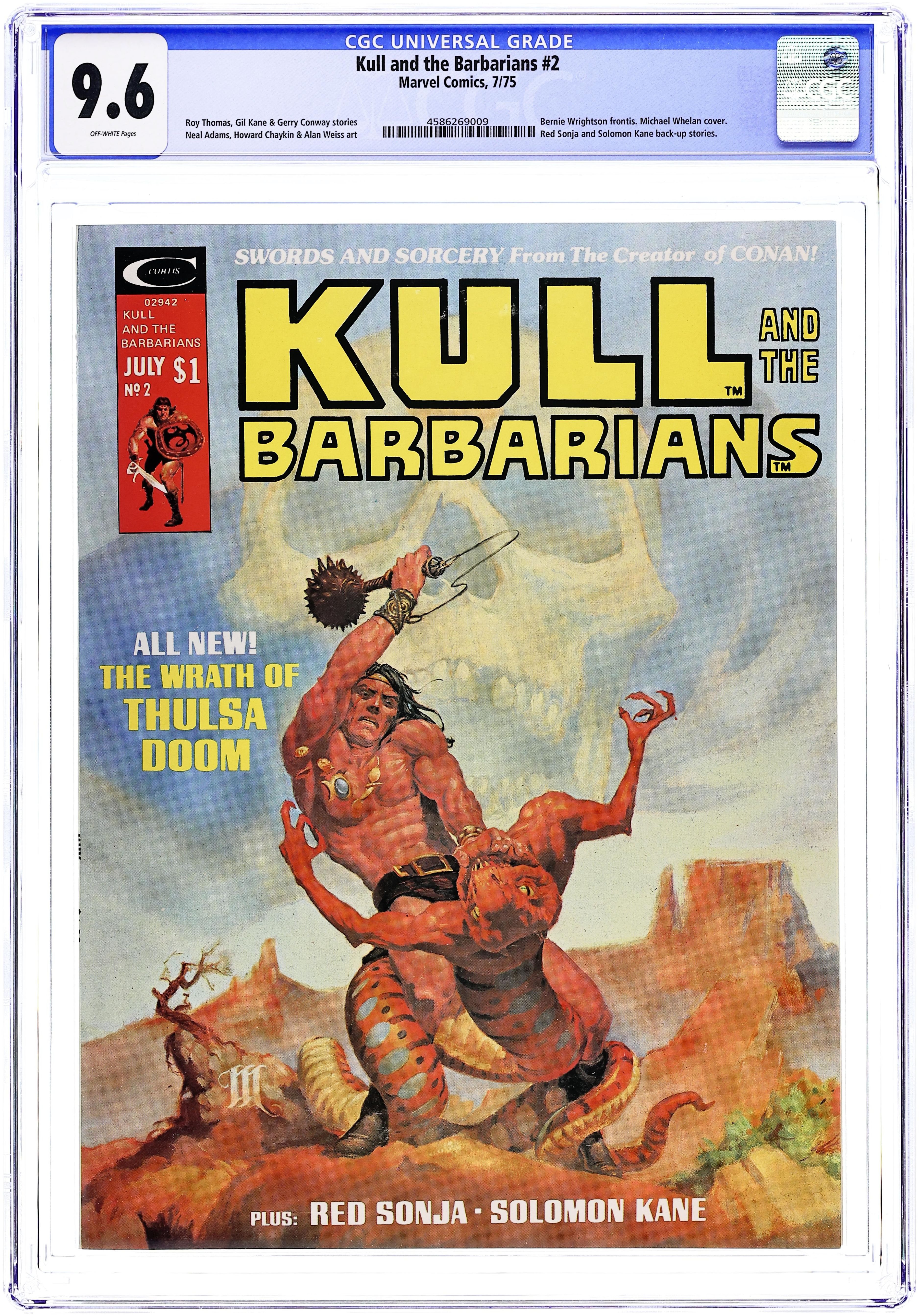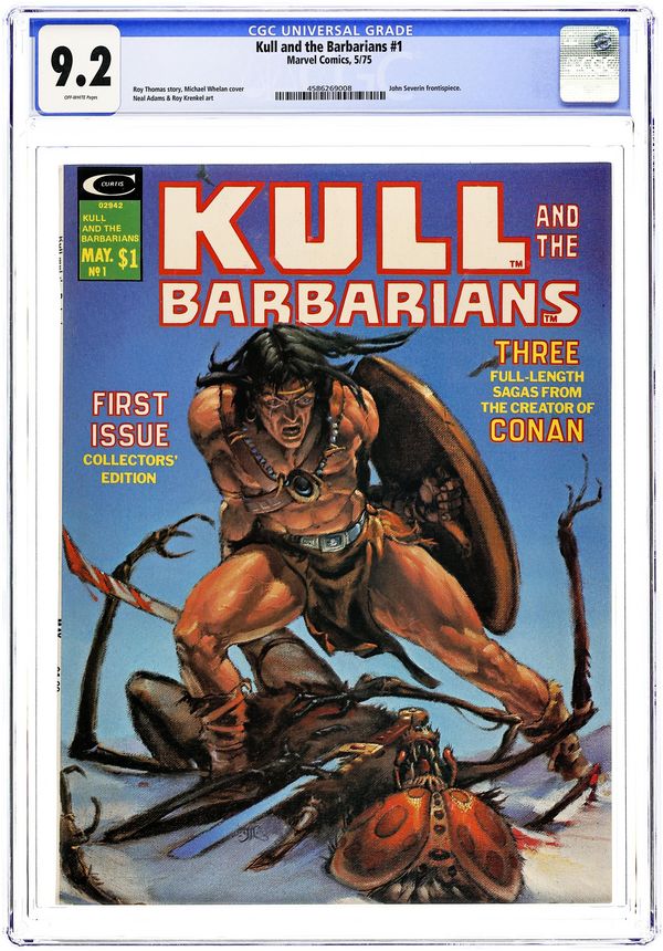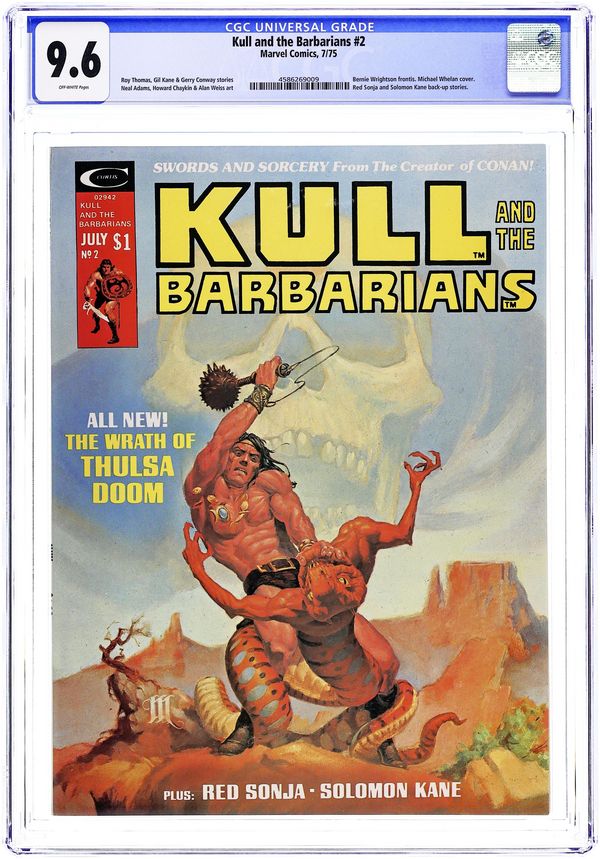 2 pages new Neal Adams art (text illos): King Kull, Bran Mak Morn, Solomon Kane, and Red Sonja. The rest are reprints: "A King Comes Riding" from Kull the Conqueror 1 (script by Roy Thomas, pencils by Ross Andru, inks by Wally Wood; adapted from stories by Robert E. Howard), "The Shadow Kingdom" from Kull the Conqueror 2 (script by Thomas, pencils by Marie Severin, inks by John Severin), and "The Valley of the Worm" from Supernatural Thrillers 3 (pencils by Gil Kane, inks by Ernie Chan). New Michael Whelan cover painting. Cover price $1.00.