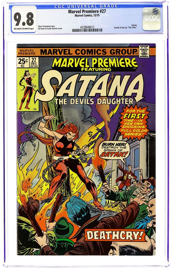 "Deathsong" Chris Claremont script. Art by The Tribe and Janice Cohen. First full-color solo story featuring Satana. While traveling through California, Satana encounters a young woman who's being chased by a mob claiming she's a witch. However, Satana gets more than she bargained for after she has the woman freed. Also included is a back-up reprint story of Satana's first appearance from Vampire Tales #2. 32 pgs. Full color. 25 cent cover price. Cover price $0.25.