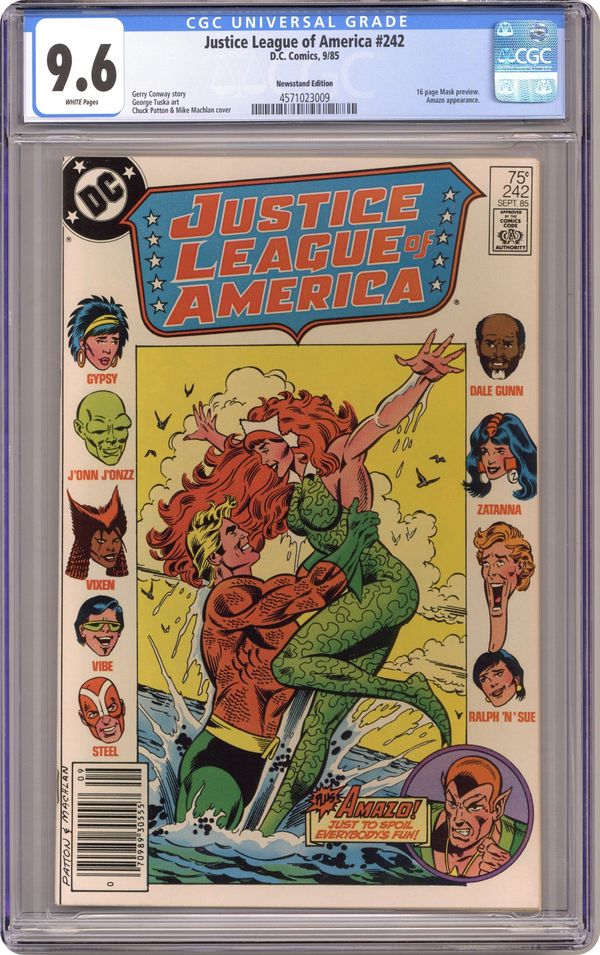 The League battles Amazo...and a broken heart! Aquaman can no longer live without Mera! But can he win her back? Part 2 of 3, concludes next issue. Written by Gerry Conway, with art by George Tuska and Mike Machlan. Cover by Chuck Patton and Machlan. Cover price $0.75.