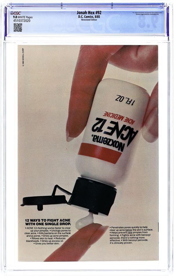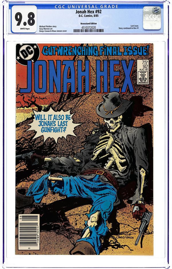 Newsstand Edition. In this last issue of Jonah Hex, Jonah goes out in "A Blaze of Glory!" Hex faces off with villains in the West when he suddenly disappears from the late 1880's and reappears in the 21st century sometime after a nuclear war. Continues in Hex (1985) #1. Written by Michael Fleisher, with art by Gray Morrow. Cover by Denys Cowan and Klaus Janson. Cover price $0.75.
