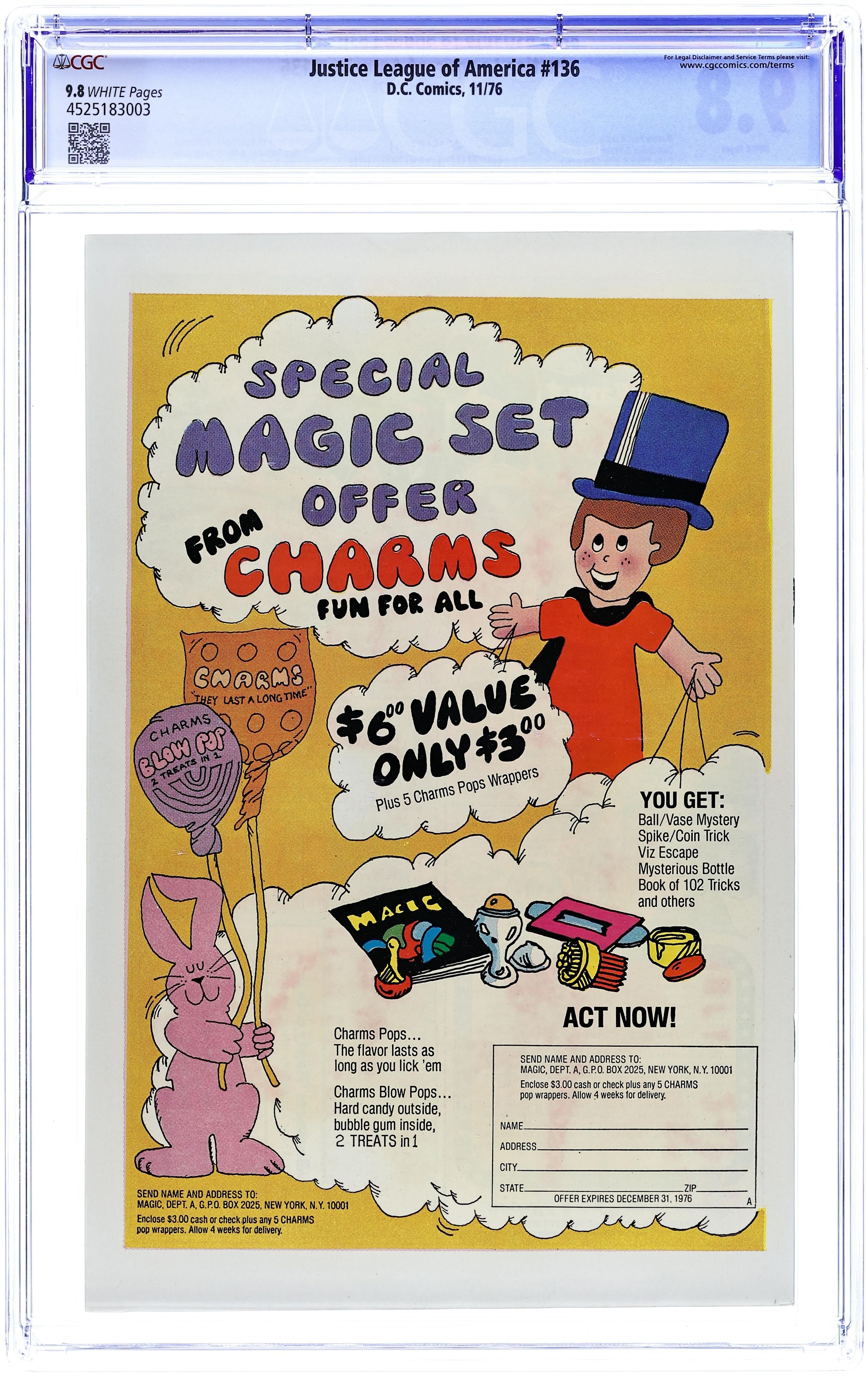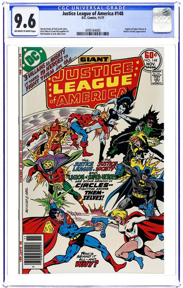 Cover pencils by Rich Buckler, inks by Jack Abel. Crisis in Triplicate!, script by Paul Levitz and Martin Pasko, pencils by Dick Dillin, inks by Frank McLaughlin; As all three teams recover the three items, and the three demons are restored, changes have happened between the demons while imprisoned over a 1000 yrs: One wants to be peaceful, while another wants to rule everything, and the other just wants to restore the entire Earth-1 universe back to how it was before they were first captured. Eventually, the JLA/JSA/Legion teams defeat all three demons and Mordru, and go their separate ways. 52 pgs. $0.60. Cover price $0.60.