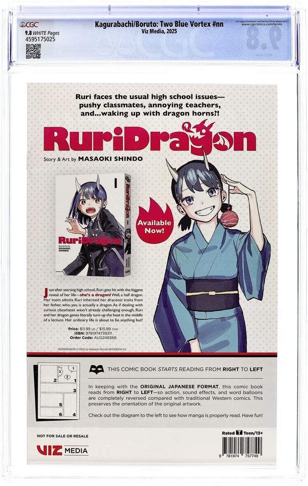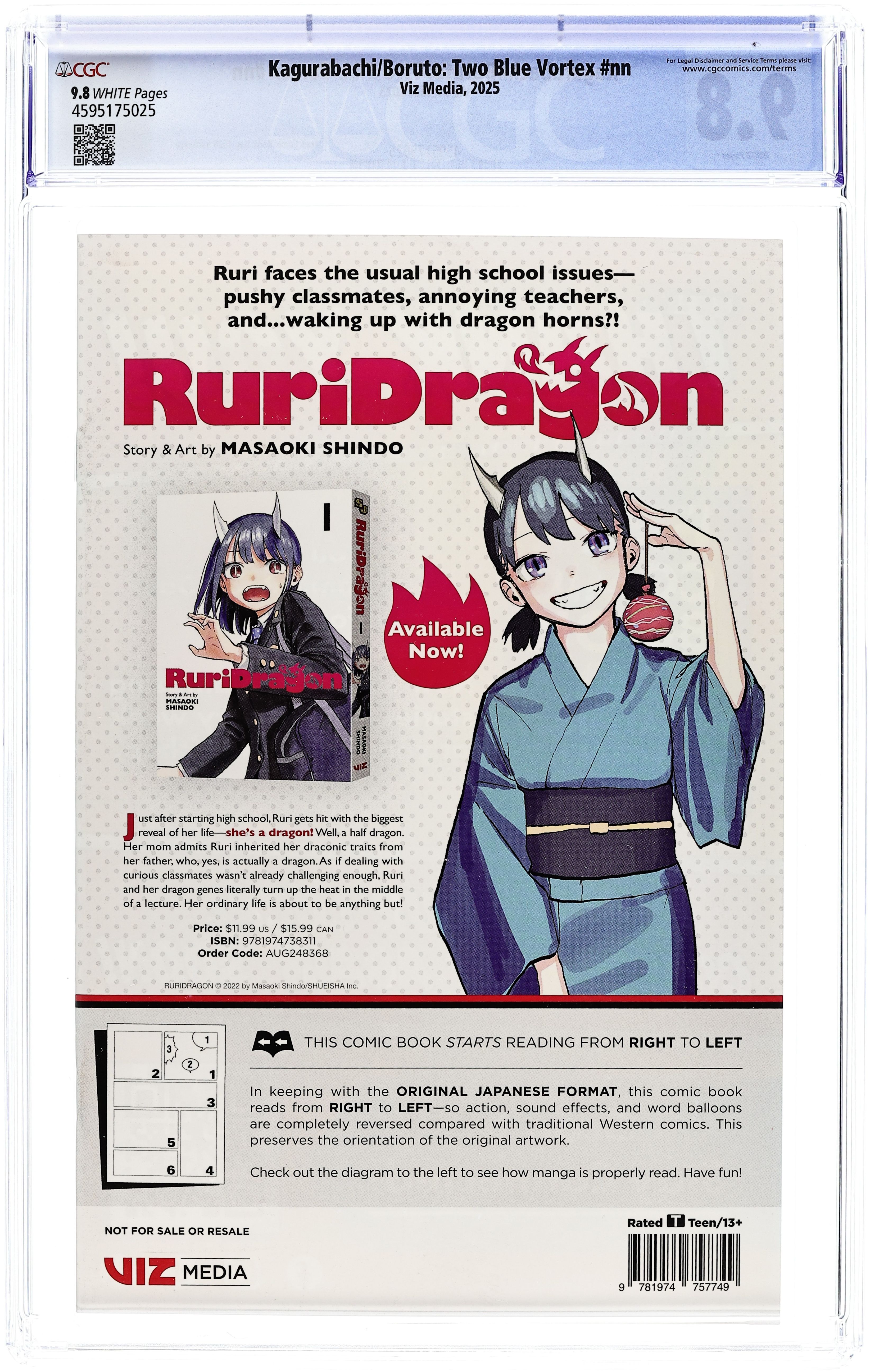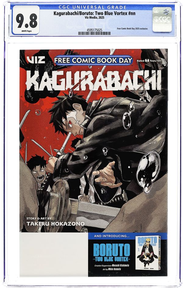 (W) Takeru Hokazono, Masashi Kishimoto (A) Takeru Hokazono, Mikio Ikemoto Kagurabachi: Chihiro's father, Kunishige, is a renowned swordsmith whose six enchanted blades ended the nation's war. After retrieving and hiding the swords, sorcerers raid their home, killing Kunishige before Chihiro's eyes. Years later, Chihiro sets out with Kunishige's seventh and final blade to reclaim the stolen swords. Boruto: Two Blue Vortex: Naruto, once a mischievous shinobi, achieved his dream of becoming the greatest ninja and now graces the Hokage monument. But this isn't his story. A new generation, led by his son Boruto, rises in the swirling vortex of a new ninja era! Reprint Material Rating: Teen