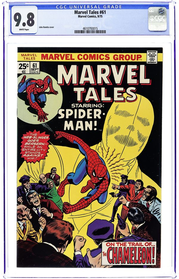 Cover by John Romita. Reprints Amazing Spider-Man #80. "On the Trail of the Chameleon!", script by Stan Lee, breakdowns by John Buscema, art by Jim Mooney; Harry brings Flash to Peter's apartment and forces them to work out the confusion about Gwen; Peter and Gwen reunite and attend a gala where paintings are stolen under the nose of Capt. Stacy - it is the work of the Chameleon; Spidey sets a trap for the Chameleon but fails to unmask him until he sees…Peter Parker! 36 pgs., full color. $0.25. Cover price $0.25.