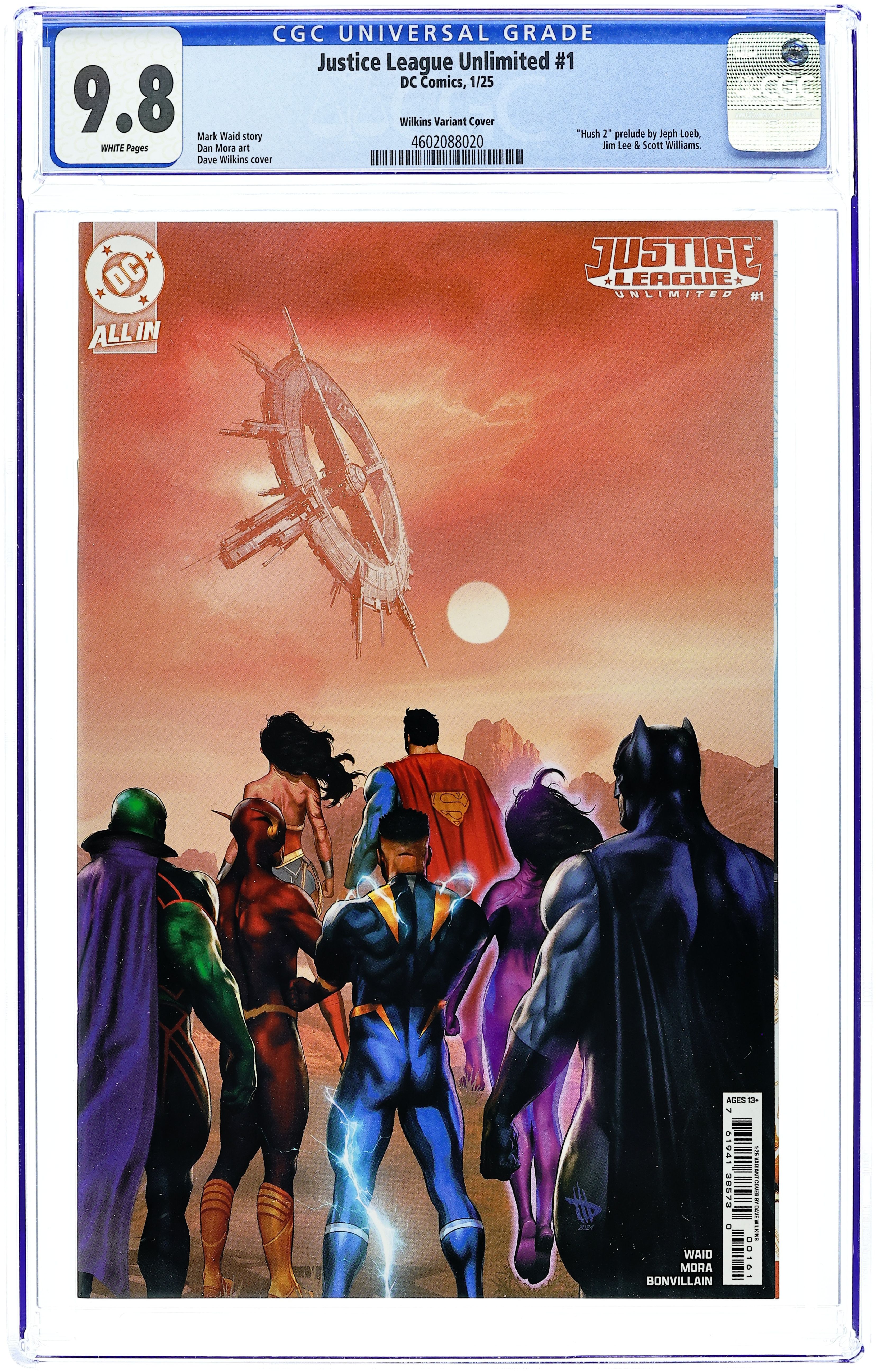 Limited 1 for 25 Retailer Incentive Variant Cover. Written by Mark Waid. Art by Dan Mora. Cover by Dave Wilkins. THE WATCHTOWER RISES! The Justice League is back and bigger than ever! In the wake of Absolute Power and the DC All In Special, Darkseid's death has triggered a massive power vacuum in the DCU, and Superman, Batman, and Wonder Woman must unite like never before and expand the Justice League to encompass every hero championing the forces of good in the face of incredible evil! As our heroes work to uncover the mystery of the dark lord's successor, Ray Palmer's Atom Project triggers a race between hero and villain to control the fate of metahuman abilities on planet Earth, which threatens to destroy everything the League has built. Worlds will live, worlds will die, and a surprise is waiting in store on the last page...Do not miss the dawn of the new era of justice--it all begins here! 32 pages, full color. Rated T+ Cover price $4.99.