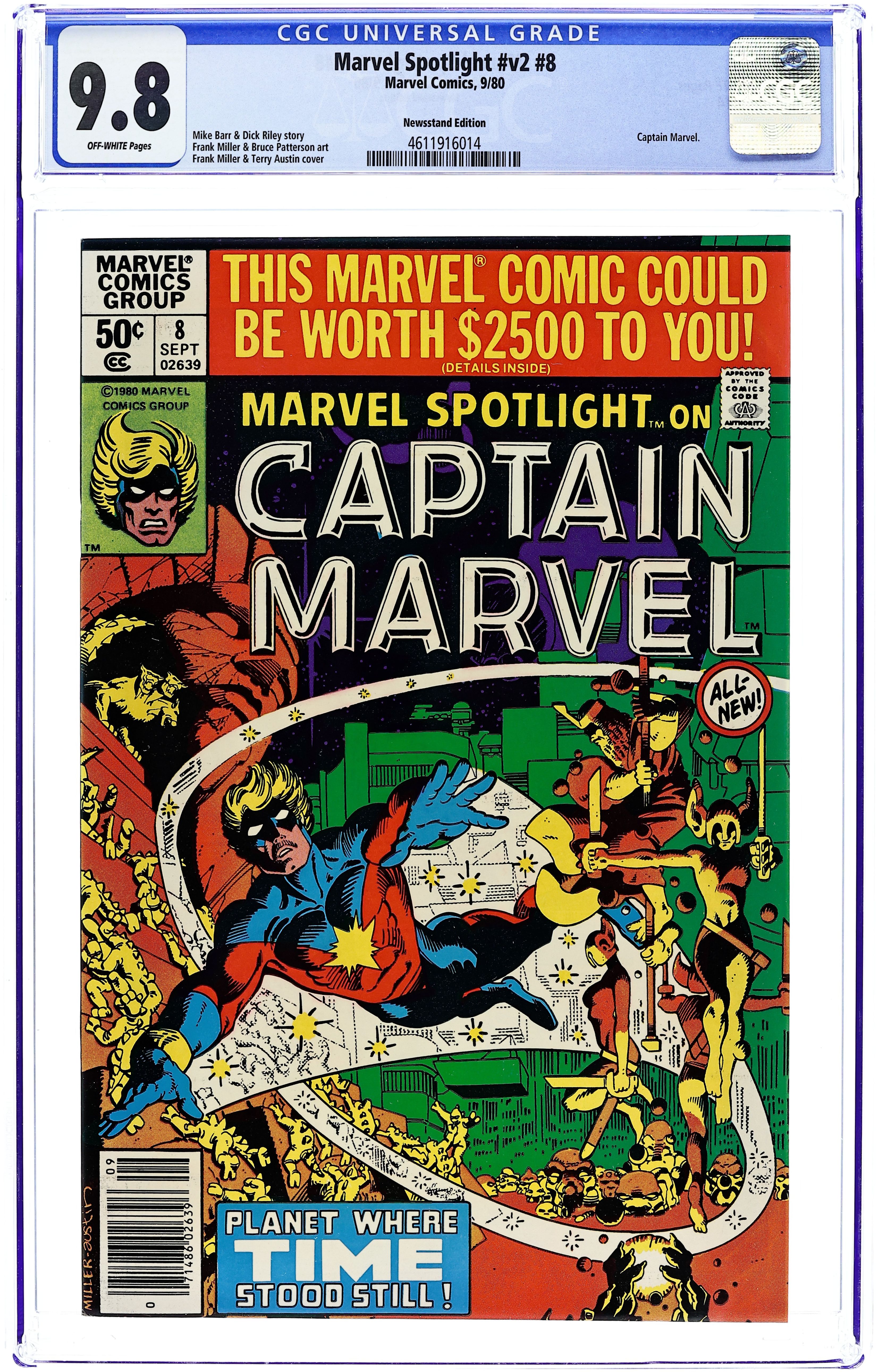 Newsstand Edition. Marvel Spotlight on Captain Marvel - "Planet Where Time Stood Still!" Written by Mike Barr and Dick Riley. Art by Frank Miller and Bruce Patterson. Cover by Frank Miller and Terry Austin. The cosmic avenger, Captain Marvel, returns! But can even the Protector of the Universe survive the planet where time stood still? 32 pages, FC. NOTE: First 50-cent cover price. Cover price $0.50.