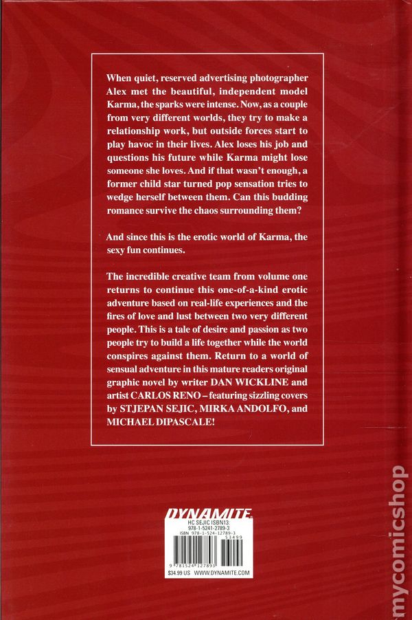 Volume 2 - 1st printing. Written by Dan Wickline. Art by Carlos Reno. Cover by Stejpan Sejic. When their original graphic novel Karma made its debut in 2022, writer DAN WICKLINE and artist CARLOS RENO set a new standard for erotic comics storytelling with their one-of-a-kind romantic adventure based on Wickline's real-life experience in the heady world of high fashion and photography. Now, the powerhouse creative team have reunited for an all-new sequel in Karma 2, continuing the story of advertising photographer Alex and supermodel Karma. As their relationship deepens, the lovers face new challenges and opportunities while trying to navi-gate the ups and downs of the creative life. Alex loses his job and begins to question his future, while Karma is faced with saying good-bye to someone she loves and opening the door to more serious -commitment. And if that wasn't enough to deal with, a former child star turned pop sensation is trying to wedge herself between the two of them. Can this budding romance survive the chaos - and the temptations that surround them? Find out in the lushly rendered pages of Karma 2, available in both trade paperback and hardcover editions (including a special hard-cover edition signed by the author), all featuring a stunningly sensual cover painting by acclaimed artist STJEPAN SEJIC! Hardcover, 136 pages, full color. Mature Readers Cover price $34.99.