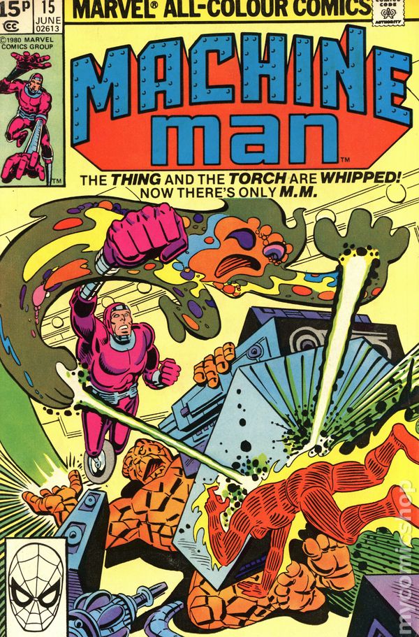 UK edition. Identical to US edition, but has 15p cover price. Written by Tom DeFalco. Art and Cover by Steve Ditko. The Fantastic Four's Thing and Torch get whipped! Now there's only...Machine Man! Starring Machine Man, Human Torch [Johnny Storm], the Thing, Oswald F. "Gears" Garvin (introduction), Pamela Quinn, Ion [Voletta Todd] (introduction, villain), Mr. Fantastic (cameo) and Invisible Girl (cameo). 6.75" x 10.25", 32 pages, FC.