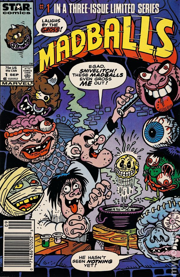 Newsstand Edition. The Madballs end up in a baseball game with the kids and when nearby Dr. Viktor Frankenbeans sees the odd-looking balls that look alive, he wants them for a scientific discovery which will enable him to win the Nobel Prize in "The Evil Dr. Frankenbeans." Issue also has "Corn-Ered" in which the Madballs have to rescue the kids who have been kidnapped by the evil Colonel Corn and his corn field empire. Scripts by Michael Gallagher and art by Howie Post & Roberta Edelman. Cover price $0.75.