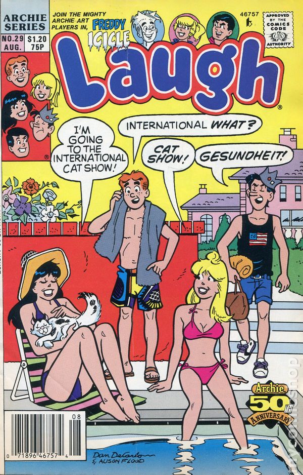 Canadian Price Variant. $1.20 cover price. Cover pencils by Dan DeCarlo, inks by Alison Flood. "Freddy Icicle," script by George Gladir, pencils by Stan Goldberg, inks by Mike Esposito; Parody of Edward Scissorhands. Betty is delivering newspapers and wanders into an abandoned house and meets Freddy Iciclehands. Archie's Environmental Tip public service announcement. "Separate Vacations," script by Hal Smith, pencils by Stan Goldberg, inks by Mike Esposito; Each member of Josie and the Pussycats goes on a separate vacation to blow off steam and end up thinking about each other. "Tee Vee Magic," script by George Gladir, pencils by Stan Goldberg, inks by Mike Esposito; Hilda has a magic zapper that transport her and Sabrina inside the TV; They participate in commercials and Wheel of Fortune. "I [heart] Cycling," script by George Gladir, pencils by Tim Kennedy, inks by Rudy Lapick; Dilton convinces Archie to give biking a try because it saves on pollution; He has a tough time with it at first but ends up getting a date with some Dutch exchange students. 36 pgs., full color. Cover price $1.20.