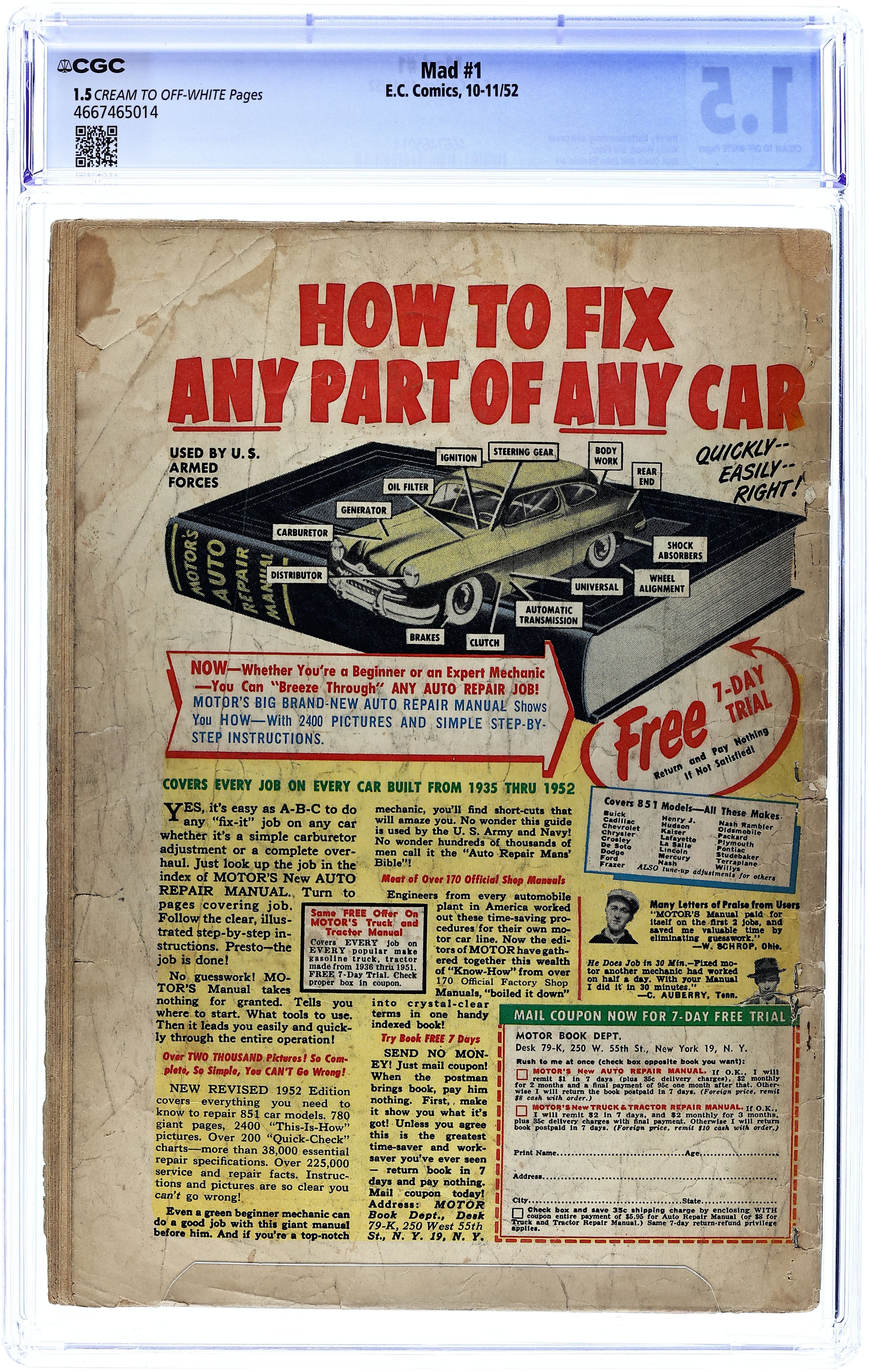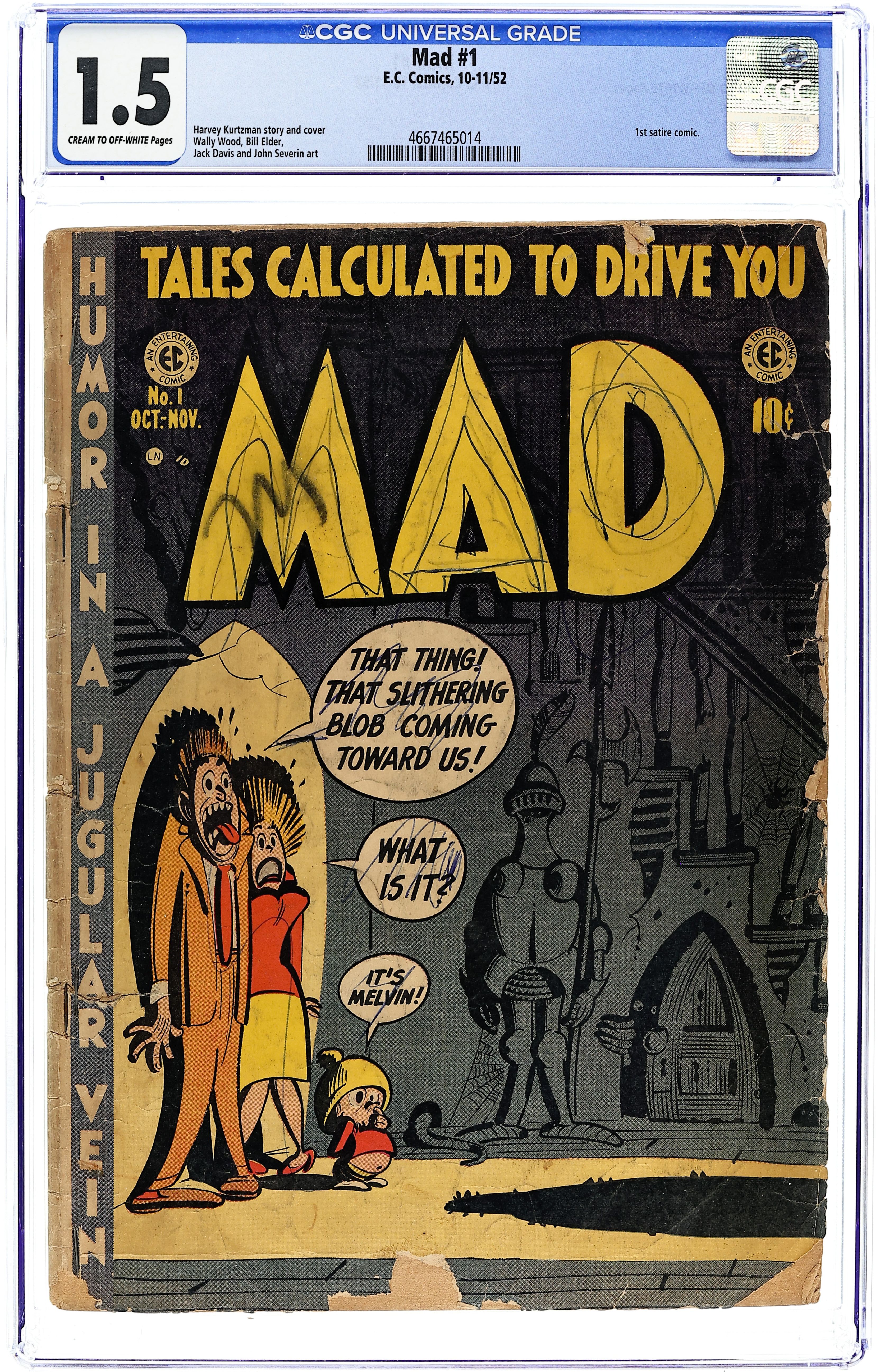 Debut issue of the iconic publication Mad, which would change to magazine format with issue 24. Cover by Harvey Kurtzman. "Hoohah!", script by Harvey Kurtzman, art by Jack Davis; Two youngsters run out of gas and enter a house they think is haunted. "Blobs!", script by Harvey Kurtzman, art by Wally Wood; Alfred outlines a terrible thought he has about the end of humanity. "Enter Cosmo McMoon!" text story by Harvey Kurtzman. "Crow Vadis?" text story by Harvey Kurtzman. "Ganefs!", script by Harvey Kurtzman, art by Bill Elder; A perfect crime is hatched but Bumble fumbles. "Varmint!", script by Harvey Kurtzman, art by John Severin; Textron is hunting the killer of Melvin and kills every suspect. 36 pgs., full color. $0.10. Cover price $0.10.