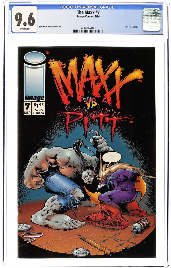 Starts Feb 9 Cover art by Sam Kieth. The Pitt, script by Sam Kieth (plot) and William Messner-Loebs (script), pencils by Sam Kieth, inks by Sam Kieth and Jim Sinclair (finishes); While Maxx battles the Pitt, Sarah talks to a lump of clay. 36 pgs. $1.95. Cover price $1.95.