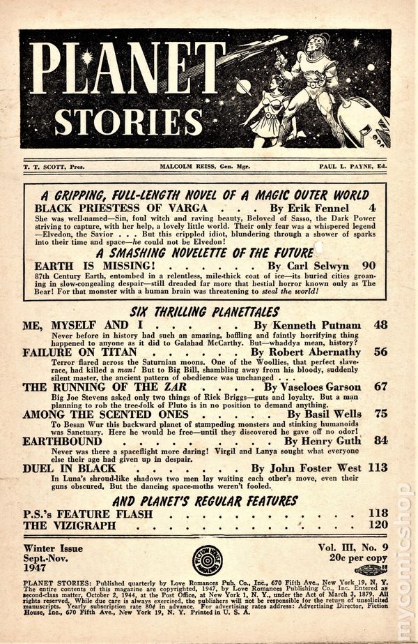 Winter 1947. Cover by Allen Anderson. "Black Priestess of Varda" by Erik Fennel, plus other stories by Carl Selwyn, Kenneth Putnam, Robert Abernathy, Vaseloes Garson, Basil Wells, Henry Guth, and John Foster West. Illustrations by Aiden McWilliams, Herman Vestal, Martin, Astarita, Sharp. 7-in. x 9.75-in.; black and white; 128 pages. Cover price $0.20.