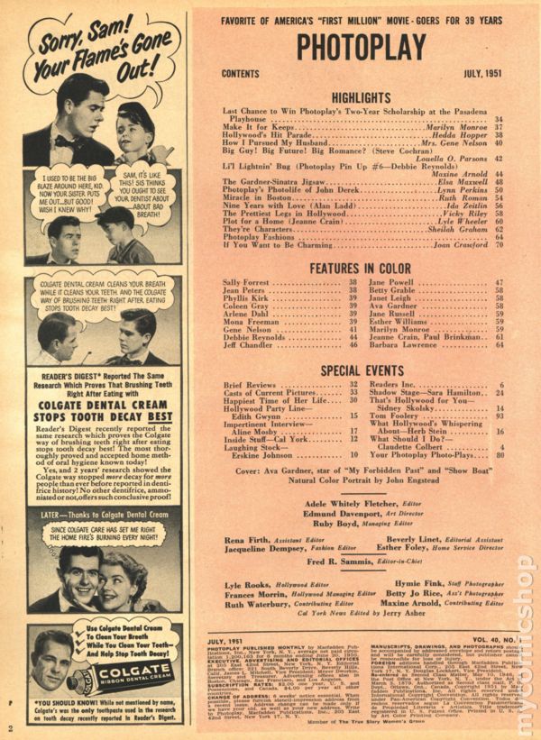 Volume 40, Issue 1 - July 1951. Hollywood magazine. Ava Gardner Cover feature, and articles including The Prettiest Legs in Hollywood and The Best Dressed Girls! 8 1/2-in. x 11-in., 96 pages, PC/PB&W Cover price $0.20.