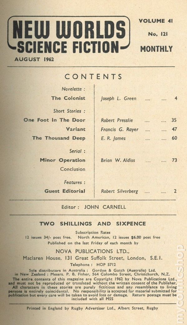 New Worlds Science Fiction (Nova Publications UK) Vol. 41 #121Tags: UK EditionsPublished Aug 1962 by Nova Publications.