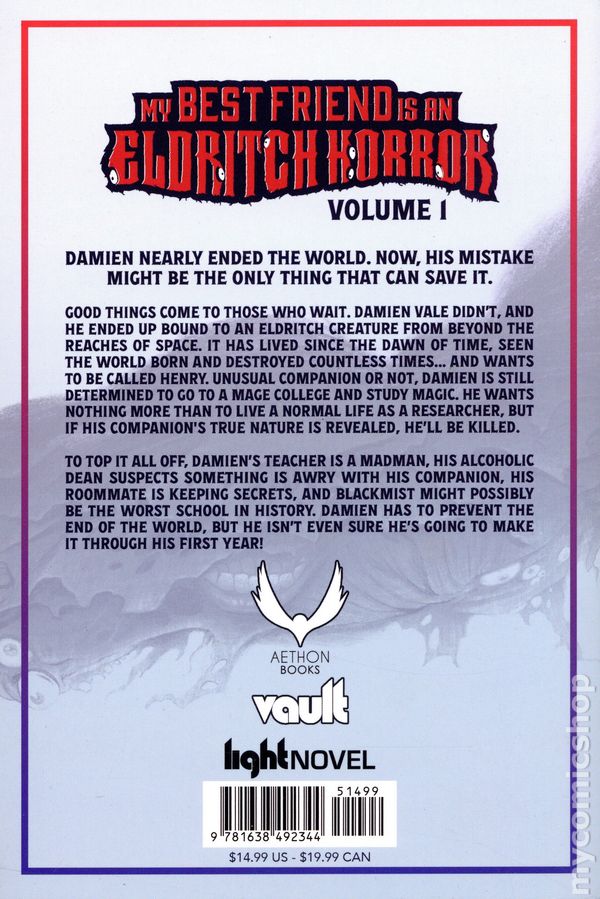 Volume 1 - 1st printing. Written by ACTUS. Art and cover by Kisaragipana. Damien nearly ended the world. Now, his mistake might be the only thing that can save it. Good things come to those who wait. Damien Vale didn't, and he ended up bound to an Eldritch creature from beyond the reaches of space. It has lived since the dawn of time, seen the world born and destroyed countless times, and wants to be called Henry. My Best Friend is an Eldritch Horror is a slice-of-life mixed with LitRPG in a magic school setting. A slow build power fantasy from Actus, the bestselling author of Morcster Chef. Softcover, 5-in. x 8-in., 256 pages, Text (B&W Chapter Illustrations). Cover price $14.99.