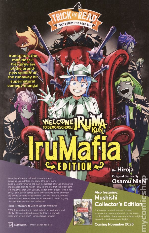 Early previews of two exciting Kodansha manga! Get the first look at one of Kodansha's most-anticipated manga ever, Mushishi Collector's Edition, the series of engrossing stories that built on Japanese folklore to create a moving and mysterious landscape all its own. Then, check out the hilarious and hellish spinoff of the hit Welcome to Demon School! Iruma-kun—the Irumafia Edition! In this retelling, Iruma has more to deal with than quizzes and classes... He's become the heir to a devilish organized crime ring!