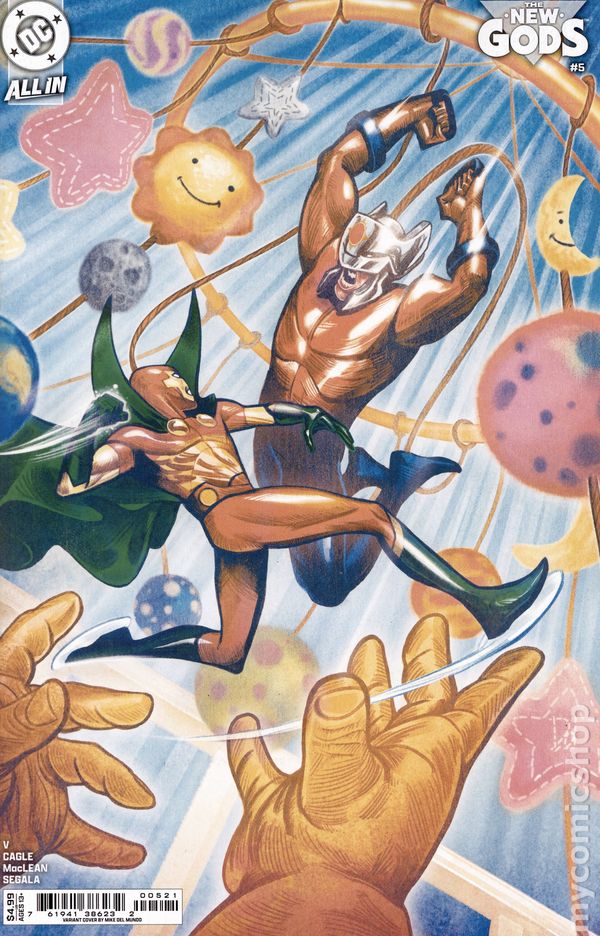 Written by Ram V. Art by Evan Cagle, Andrew MacLean. Cover by Mike Del Mundo. THE INQUISITION HAS ARRIVED! On Earth, Mister Miracle and Barda race against time to keep Kamal, the newest New God, away from the deadly clutches of Orion. But the champion of New Genesis will not rest until his savage mission has been fulfilled. And as the intergalactic inquisition of the Nyctari reaches New Genesis, the planet's natives must face a difficult decision: fight against the unstoppable invading army or abandon their homeworld and set out into the cosmos as refugees. All roads lead to Earth, a world with its own protectors... 32 pages, full color. Rated T+ Cover price $4.99.