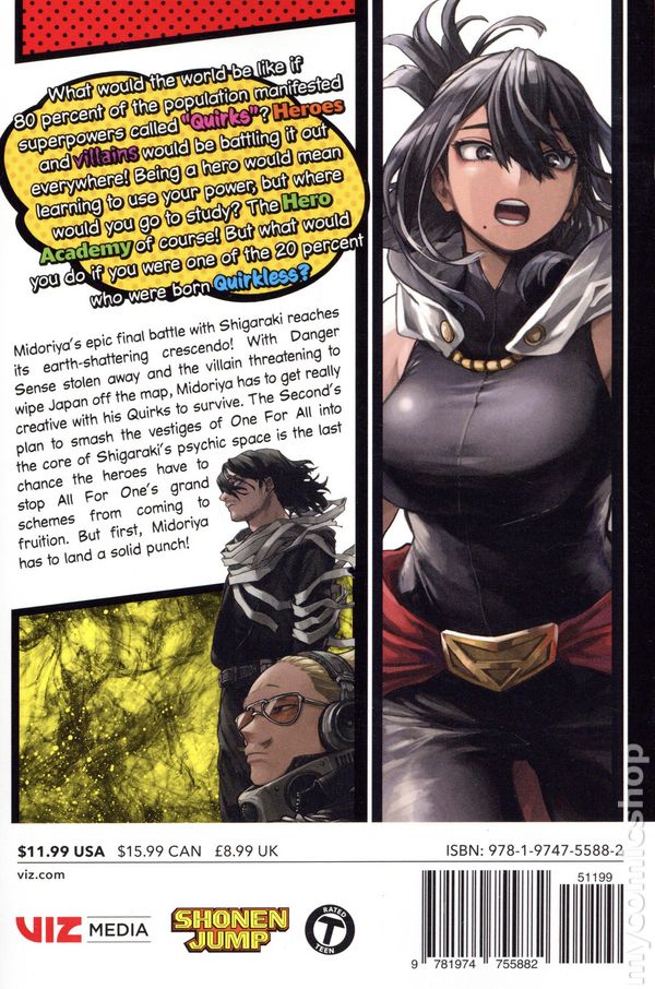 Volume 41 - 1st printing. Story and art by Kouhei Horikoshi. Translated by Caleb Cook. Midoriya's epic final battle with Shigaraki reaches its earthshattering crescendo! With Danger Sense stolen away and the villain threatening to wipe Japan off the map, Midoriya has to get really creative with his Quirks to survive. The Second's plan to smash the vestiges of One For All into the core of Shigaraki's psychic space is the last chance the heroes have to stop All For One's grand schemes from coming to fruition. But first, Midoriya has to land a solid punch! Softcover, 5-in. x 7-in., 200 pages, B&W. Teen Cover price $11.99.