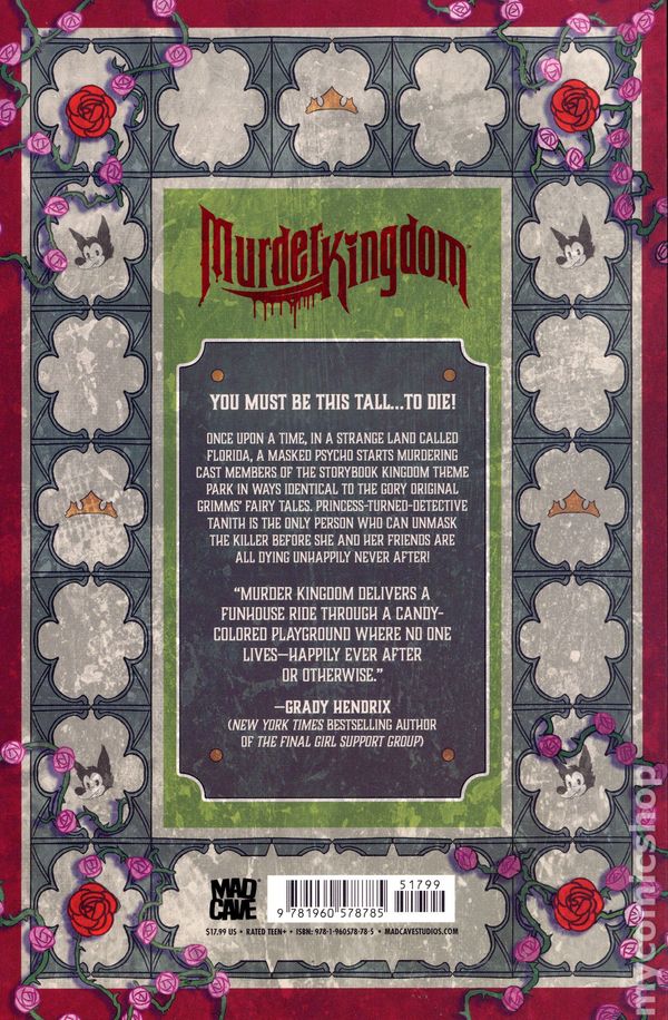 1st printing. Collects Murder Kingdom (2024 Mad Cave) #1-5. Written by Fred Van Lente. Art by Chris Panda. Cover by Paulina Ganucheau. You must be this tall…to DIE!Once upon a time, in a strange land called Florida, a masked psycho starts murdering cast members of the Storybook Kingdom theme park in ways identical to the gory original Grimms Fairy Tales. Princess-turned-detective Tanith is the only person who can unmask the killer before she and her friends are all Dying Unhappily Never After! Softcover, 112 pages, full color. Rated T+ Cover price $17.99.