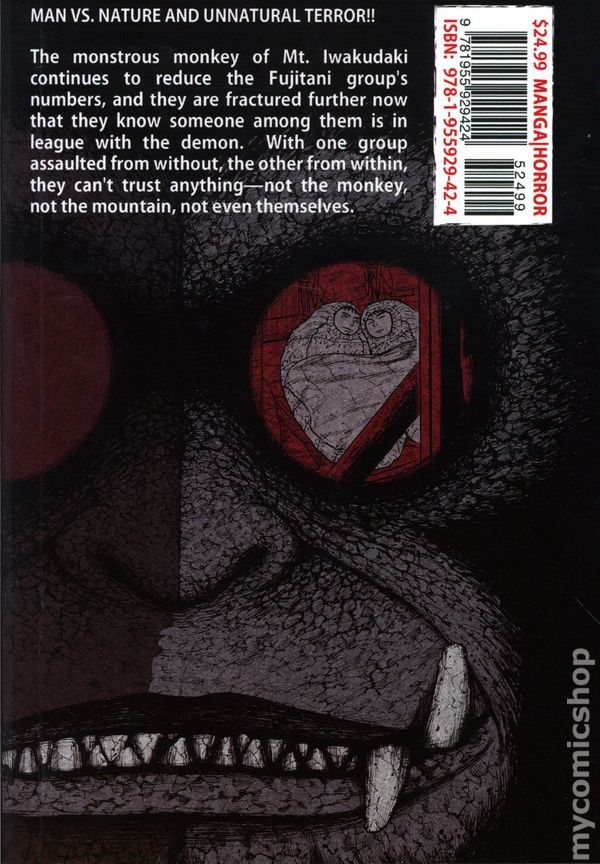 Volume 4 - 1st printing. Written by Koji Shinasaka. Art and cover by Akihiro Kumeta. Translated by Andrew Hall (Phase 6). THE HIT SURVIVAL HORROR MANGA! MAN VS. NATURE AND UNNATURAL TERROR! The monstrous monkey of Mt. Iwakudaki continues to reduce the Fujitani group's numbers, and they are fractured further now that they know someone among them is in league with the demon. With one group assaulted from without, the other from within, they can't trust anything-not the monkey, not the mountain, not even themselves. Softcover, 5-in. x 7in., 208 pages, B&W. Cover price $24.99.
