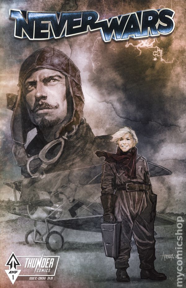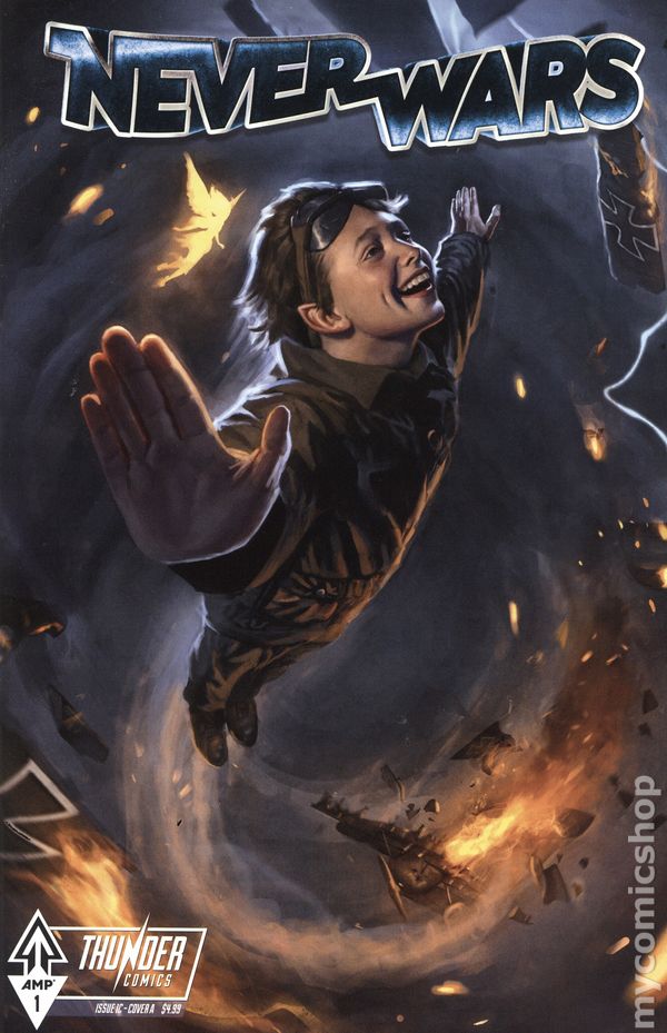 Written by Don Handfield. Art by Marcelo Basile. Cover by Aaron Bartling. The magical realms of Wonderland, Oz, and Neverland have been thrust into a devastating war that spans worlds and generations. A sinister technology created by the Jabberwock twists good into evil, turning beloved childhood figures into shadows of their former selves. Told through three uniquely illustrated and completely distinct first issues, NeverWars invites readers to experience this epic saga from multiple perspectives. Petr Pfanne, a spotter for the German Flying Circus, endures the chaos of war from his cockpit. After a crash, he awakens in Neverland, his childhood escape. But nothing is the same-he's forgotten how to fly, and the war has followed him, dragging Neverland into its relentless grasp. Start your journey into the NeverWorld with Issue 1: Petr/Neverland. 32 pages, full color. Cover price $4.99.