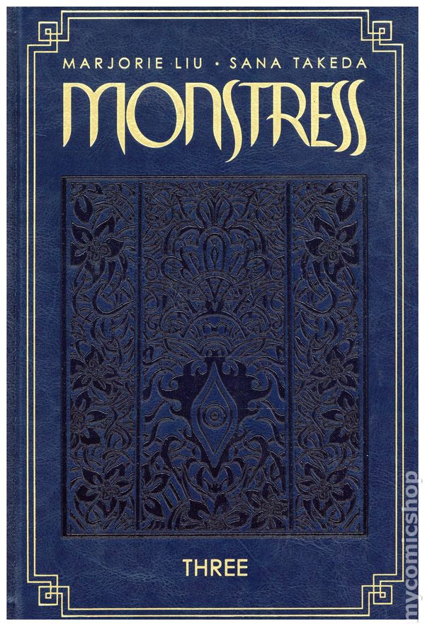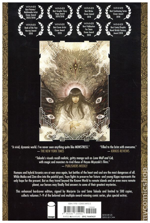 Volume 3 - 1st printing. Collects Monstress (2015 Image) #36-54. Written by Marjorie M. Liu. Art and cover by Sana Takeda. Creator/writer MARJORIE LIU and creator/artist SANA TAKEDA present a deluxe, oversized hardcover edition of their beloved breakout comic in MONSTRESS BOOK THREE. Humans and hybrid Arcanics are at war once again, but battles of the heart and soul are the most dangerous of all. Caught in the calculating grip of the Dusk Court, Maika and Zinn uncover painful secrets of the past while Tuya fights to preserve her future—and young Kippa represents the only hope for the present. MONSTRESS, BOOK THREE takes readers beyond the Known World to remote islands and an even more remote planet as our heroes finally find answers to some of their greatest mysteries. Collecting volumes 7-9 (issues #36-54) of the Eisner, Hugo, Harvey & British Fantasy Award-winning series by MARJORIE LIU and SANA TAKEDA, this deluxe, oversized hardcover brimming with more than 500 pages of art deco beauty and steampunk horror will make an elegant addition to any fan's shelf. Hardcover, 528 pages, full color. Mature Readers Cover price $49.99.