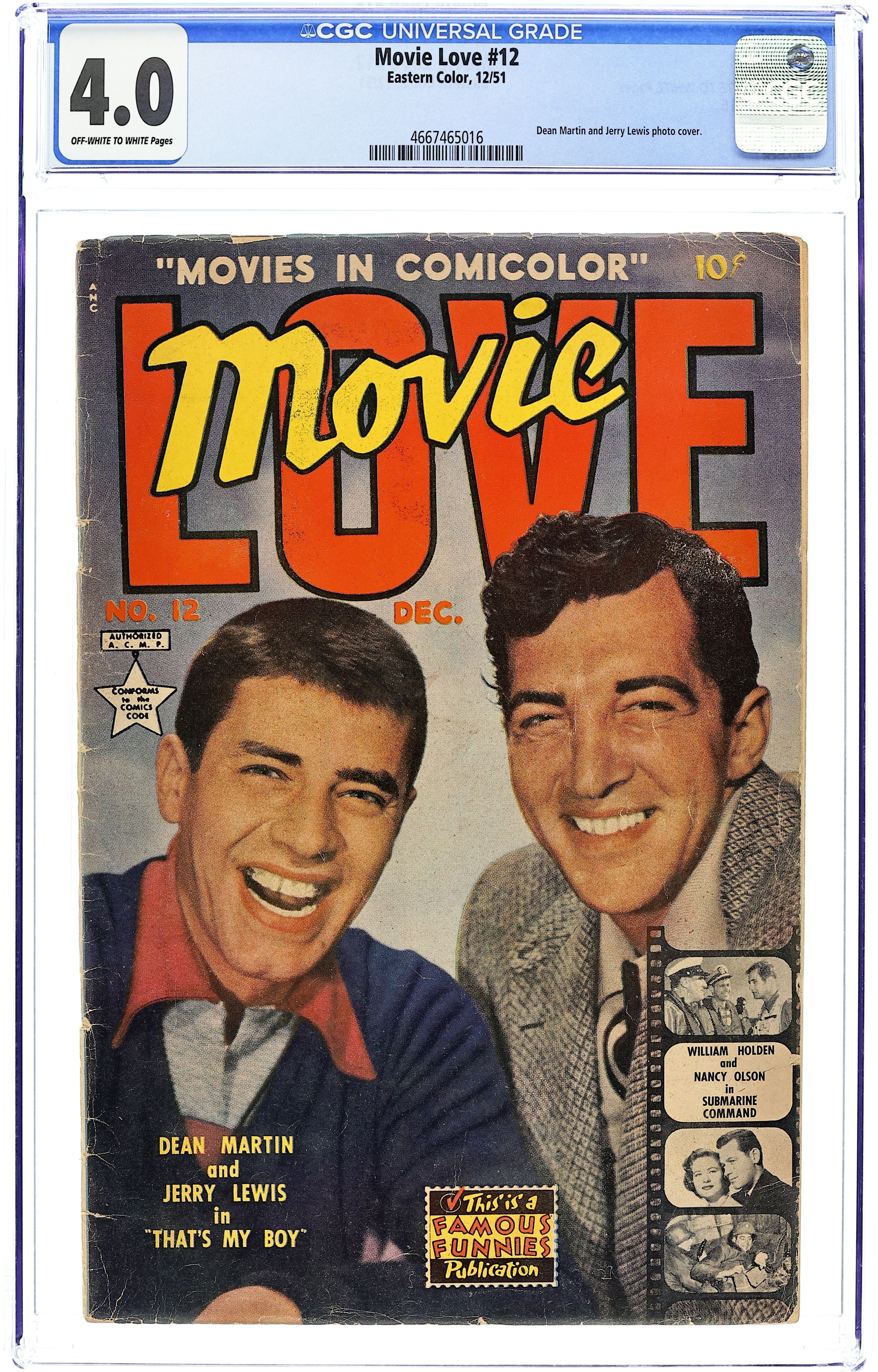 Photo cover of Bill Baker (Dean Martin) and Junior Jackson (Jerry Lewis). Nancy Olson article with photo. "Submarine Command," art by Ed Moore; Adaptation of the 1951 movie; Submarine commander Ken White remembers his wartime years aboard the USS Tiger Shark, a submarine. "Susan Hayward," art by Henry Kiefer; Susan Hayward talks about the filming of David and Bathsheba. Article on Dean Martin and Jerry Lewis. "That's My Boy," art by Harold LeDoux; Adaptation of the 1951 movie; The greatest player in the history of Ridgefield College gets his sickly, nerdy, uncoordinated son on the schools football team. Famous Funnies Patterns ad. 36 pgs., full color. $0.10. Cover price $0.10.