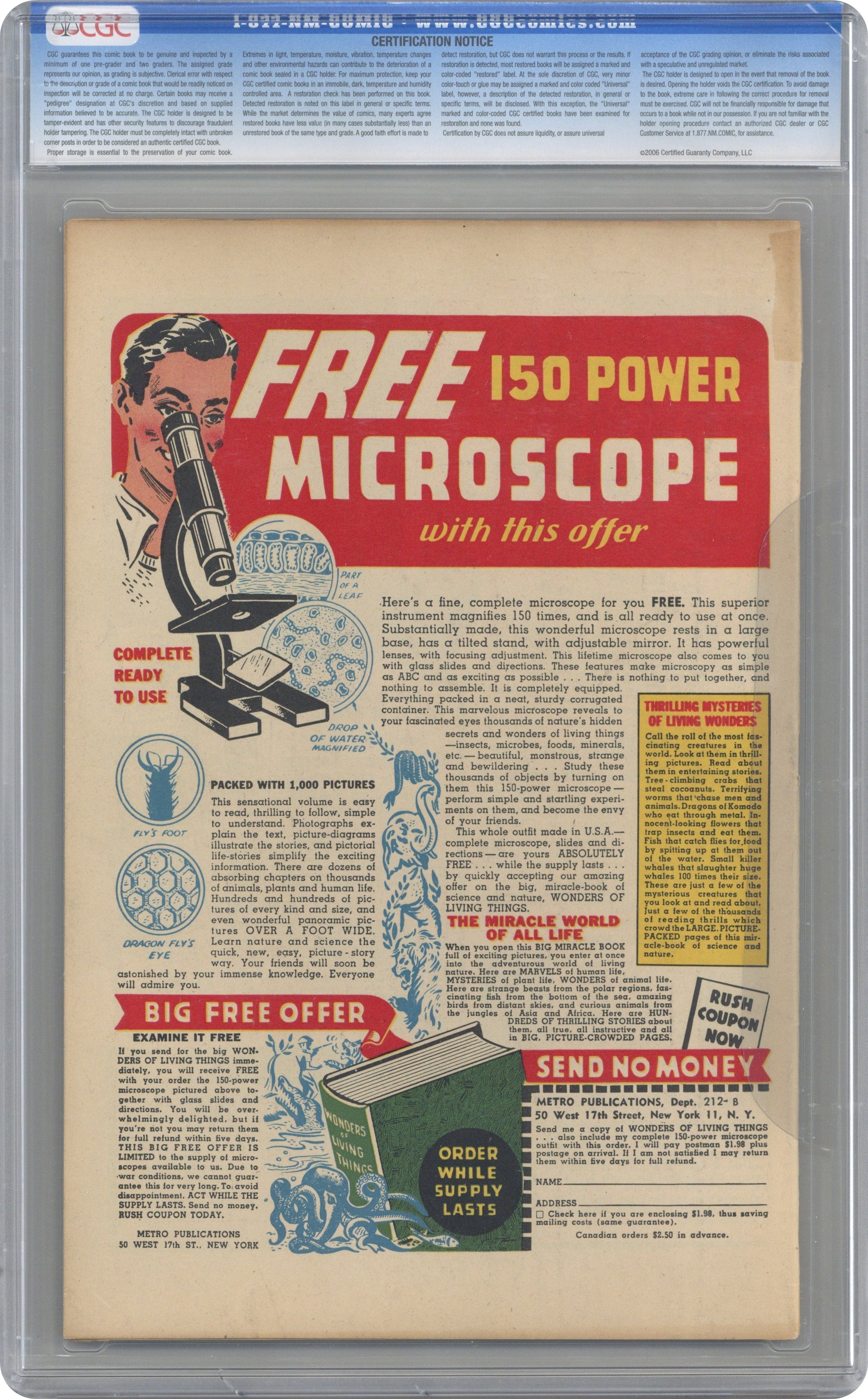 The Eye of Doom, art by Basil Wolverton; Floating eyes from Venus invade Earth. I Shall Never Die text story. Nothing, pencils by Manny Stallman; A scientist invents a time machine and then commits suicide after going ten years into the future and witnessing atomic war. The Old Lady's Son, pencils by Vernon Henkel; A gold digger becomes the victim of an old lady's vampire son. She Wouldn't Stay Dead! 36 pgs. $0.10. Cover price $0.10.