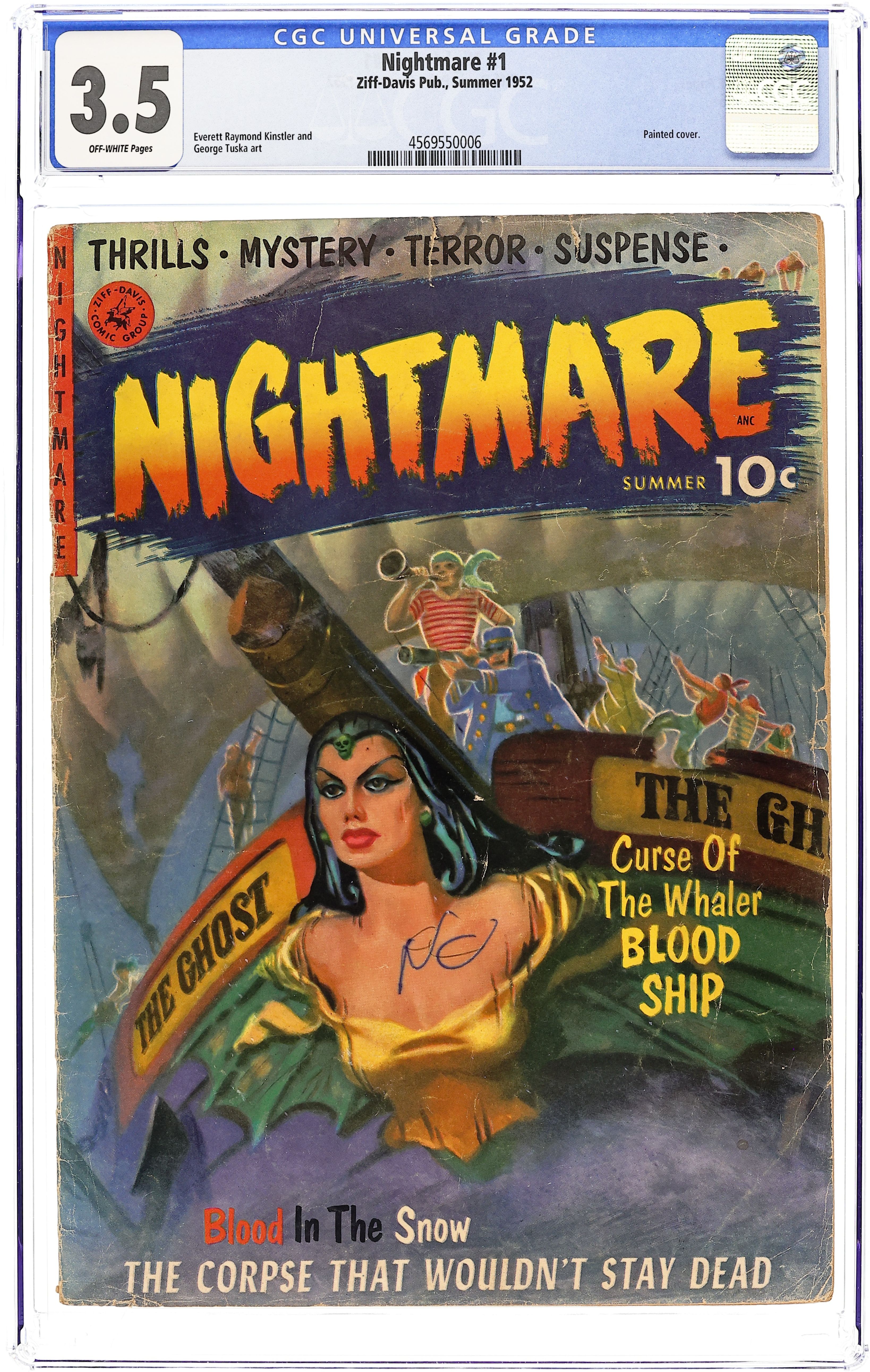 Painted cover by Allen Anderson. Stories and art by George Tuska, Everett Raymond Kinstler and Syd Shores. Pre-Code horror and suspense from Ziff-Davis, featuring their typically beautiful painted covers. A bitter one-handed sailor burns down a ship, only to be haunted by its ghost, in a story with art by future Marvel legend George Tuska. In another Tuska story, a man is haunted by his dead brother after an accident during a snowstorm. A beautiful Sri Lankan dancer does not show up on film, in a story with art by Everett Raymond Kinstler. Typically eye-catching painted cover by Allen Anderson. The Blood Ship; The Corpse That Wouldnt Stay Dead; Jardinis Jaw; The Fatal Note!; The Tunnel of Horror; Vision of the Gods! 32 pages, Full Color. Cover price $0.10.