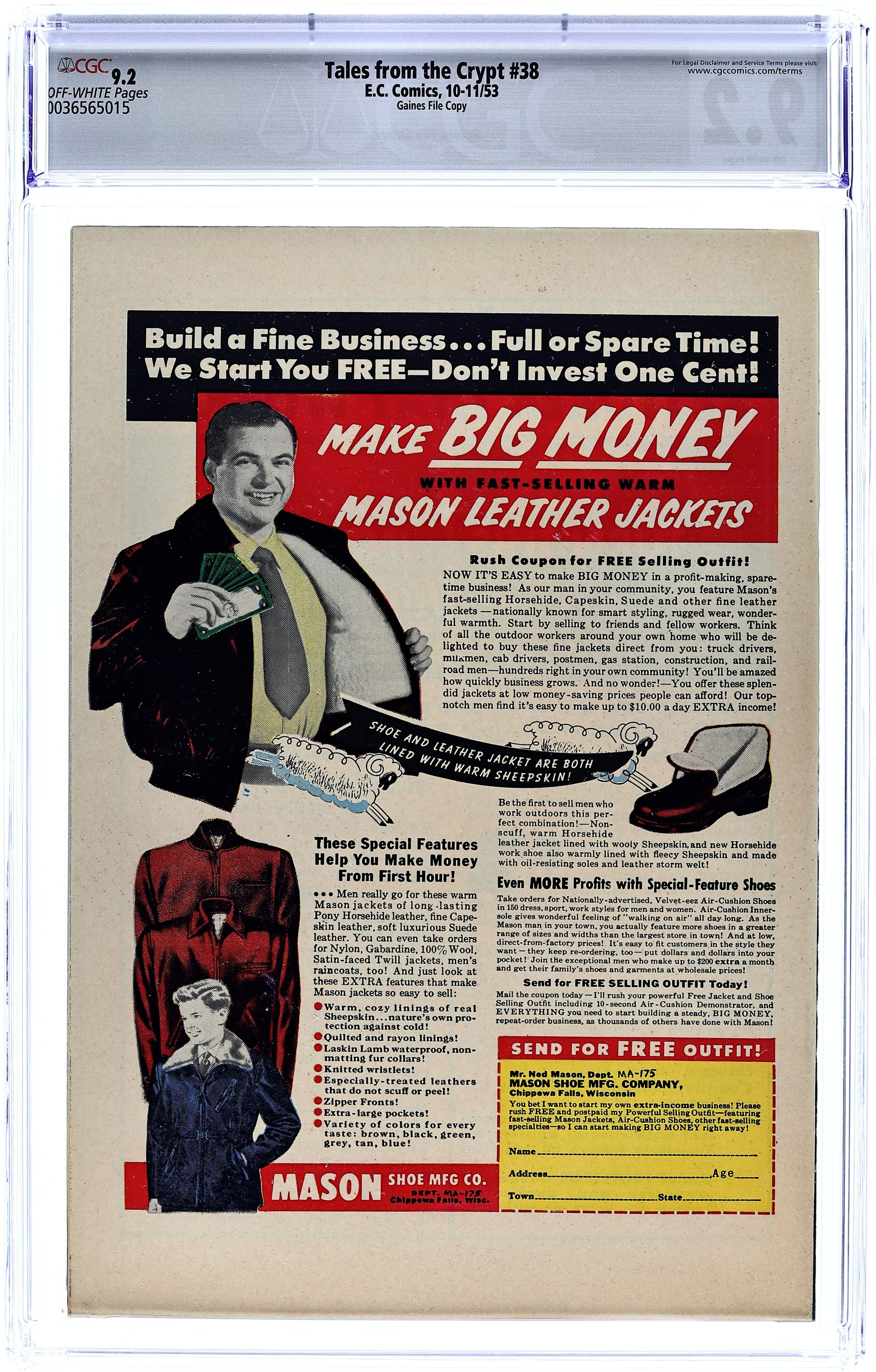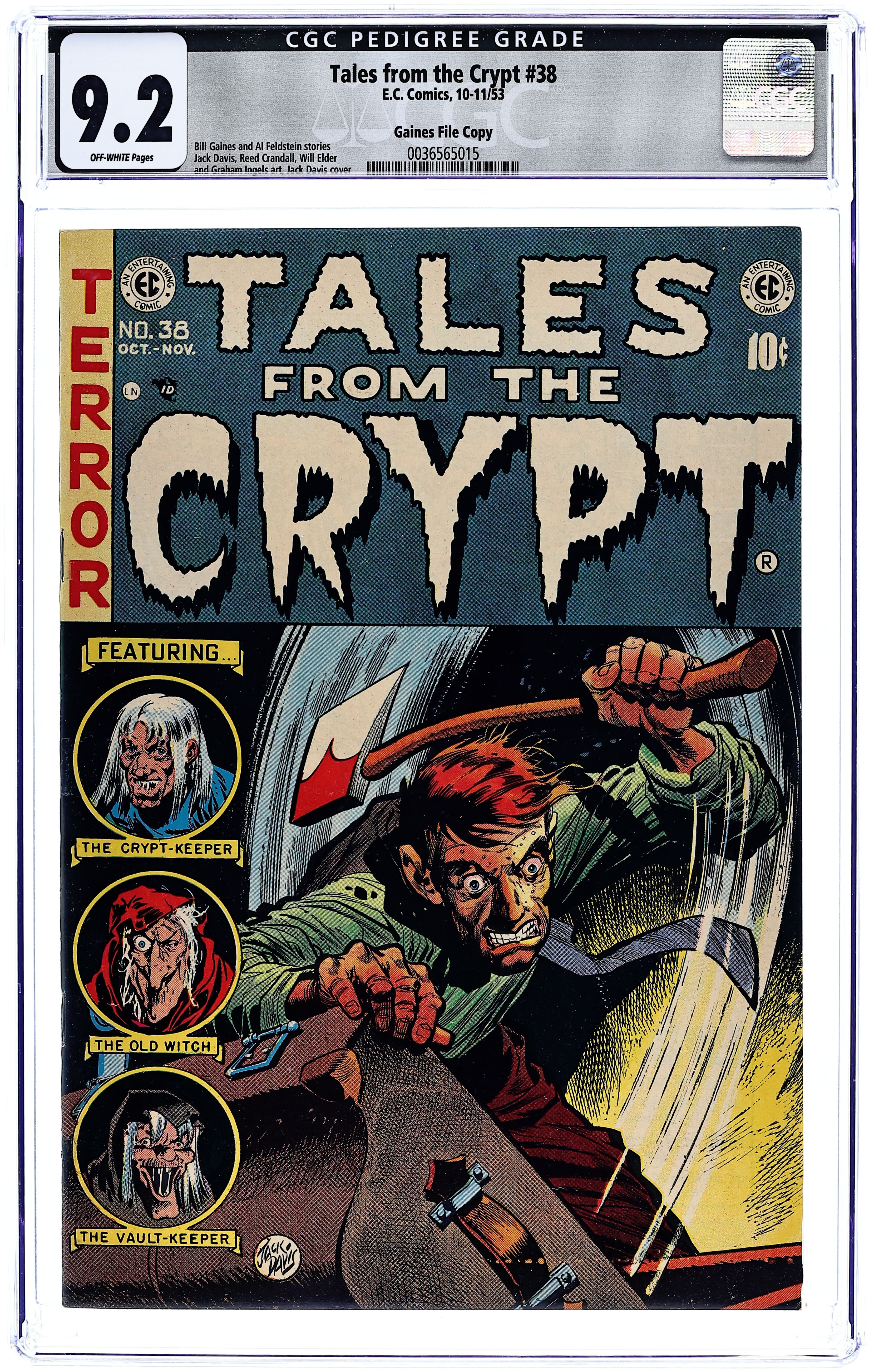 First issue of the series (continues from The Crypt of Terror). Cover by Johnny Craig. "The Thing From the Sea," script and art by Al Feldstein; During a sea voyage a passenger discovers that stateroom 13 has the reputation of being haunted. "A Fatal Caper," script by Al Feldstein, art by Jack Kamen; Teenagers remove a body from a casket in order to dress as a mystically-summoned monster and place one of their own inside as a prank; the undertaker is unaware of this and buries the body. "Backfire" text story. "Rx...Death," script by Al Feldstein, art by Graham Ingels; A sister worries that her brother is under too much stress and so asks a doctor to write a prescription for some medicine. "Impending Doom," script by Al Feldstein, art by Johnny Craig; An artist draws a frightened face with a circle around it; Thinking it odd, he goes for a walk encountering a grave-stone cutter who looks like the picture he drew carving a tombstone with his name on it. 36 pgs., full color. $0.10. Cover price $0.10.