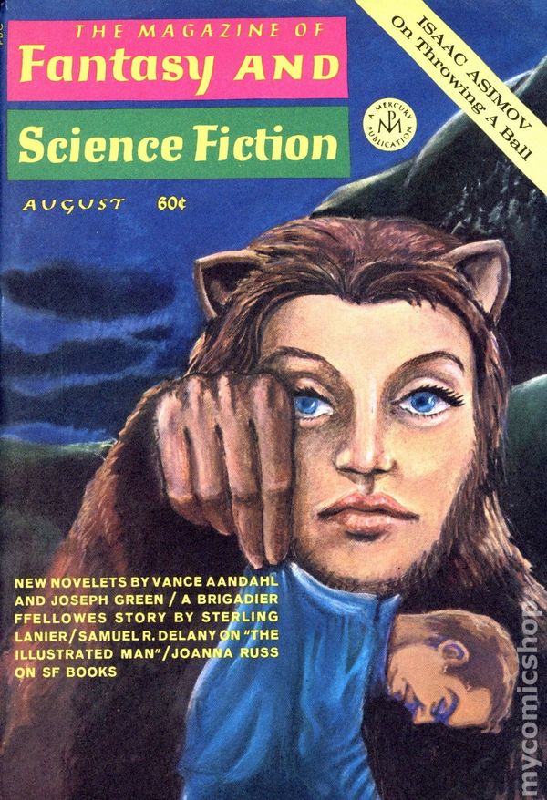 August 1969. Whole No. 219. Science fiction stories: "An Adventure in the Yolla Bolly Middle Eel Wilderness" by Vance Aandahl, "The Shamblers of Misery" by Joseph Green, "The Money Builder" by Paul Thielen, "Next" by Gary Jennings, "Fraternity Brother" by Sterling E. Lanier, and "From the Darkness and the Depths" by Morgan Robertson. Film review of Ray Bradbury's "The Illustrated Man." Cartoon by Gahan Wilson. Science article by Isaac Asimov. Cover by Ronald Walotsky. Softcover, 5-in. x 7-in., 130 newsprint pages, B&W. Cover price $0.60.