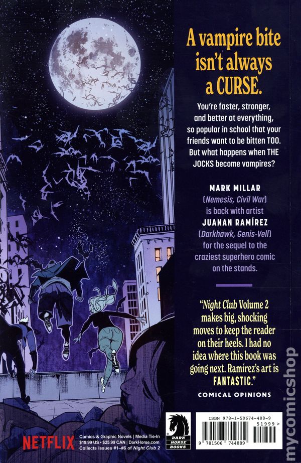 Volume 2 - 1st printing. Collects Night Club II (2024 Dark Horse) #1-6. Written by Mark Millar. Art and cover by Juanan Ramirez. You're a teenager, you've been bitten by a vampire, what would you do? Danny Garcia loves his new life and bit his best friends so they could join him leaping around rooftops every night. But one certainty with teenagers is that they're going to fall out, and when Danny's best friend Sam brings the school jocks into their vampire cult, all Hell breaks loose. Softcover, 160 pages, full color. Mature Readers Cover price $19.99.