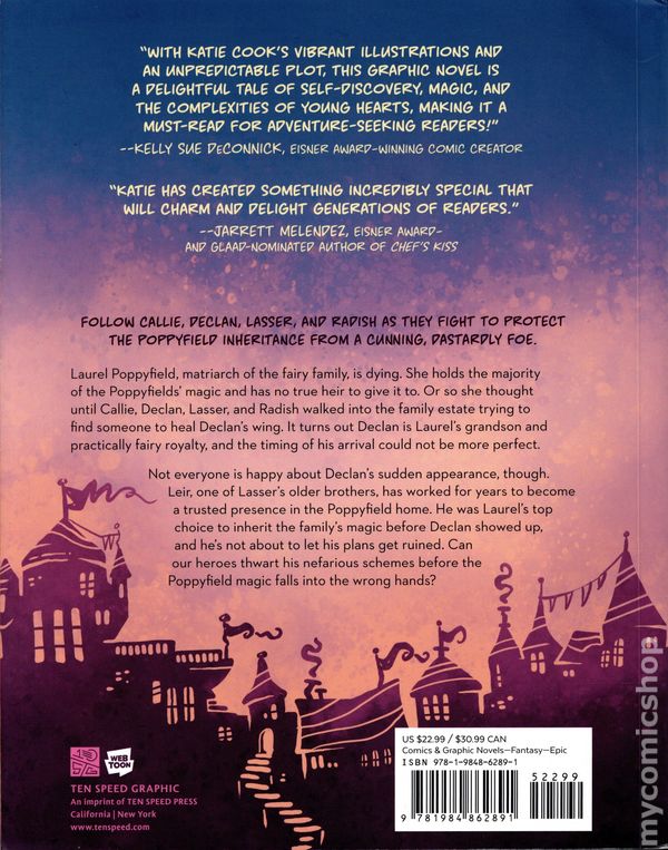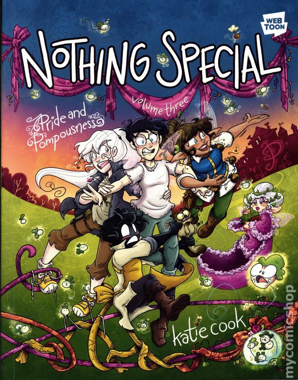 Volume 3 - 1st printing. "Pride and Pompousness!" Story and art by Katie Cook. Laurel Poppyfield, matriarch of the fairy Poppyfield family, is dying. She holds the majority of the Poppyfields' magic, and has no heir to give it to. Or so she thought until Callie, Declan, Lasser, and Radish walked into the family estate trying to find someone to heal Declan's wing. It turns out Declan is Laurel's grandson and practically fairy royalty, and the timing of his arrival could not be more perfect. Not everyone is happy about Declan's sudden appearance, though. Leir, one of Lasser's older brothers, has worked for years to become a trusted presence in the Poppyfield home. He was Laurel's top choice to inherit the family's magic before Declan showed up, and he's not about to let his plans get ruined. It's up to Callie, Declan, Lasser, and Radish to thwart his nefarious schemes before Laurel dies and the Poppyfield magic falls into the wrong hands. This volume of Katie Cook's Nothing Special collects the final 25 chapters of Season 2 of the webcomic. Softcover, 7-in. x 9-in., 384 pages, full color. All Ages Cover price $22.99.