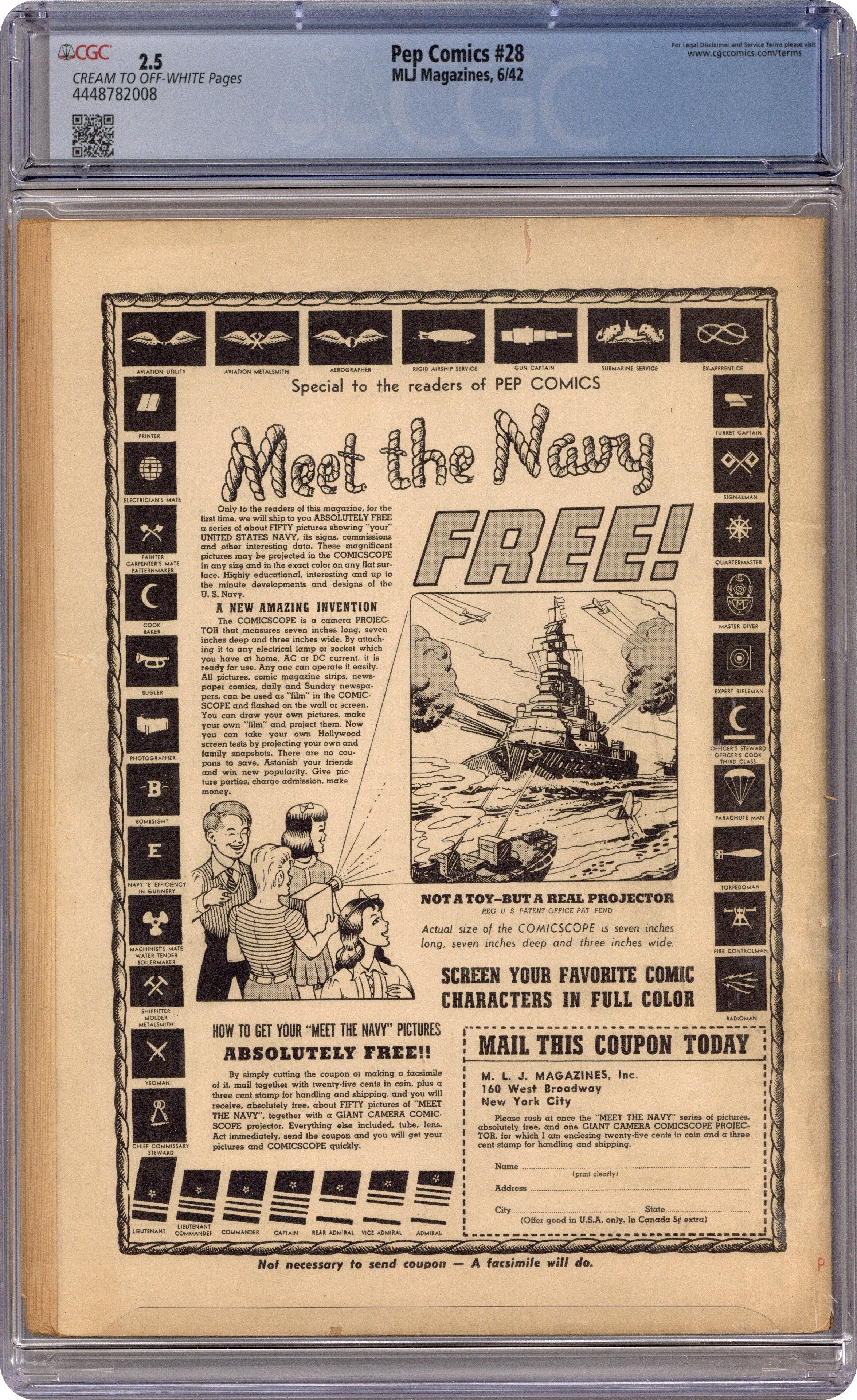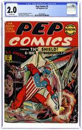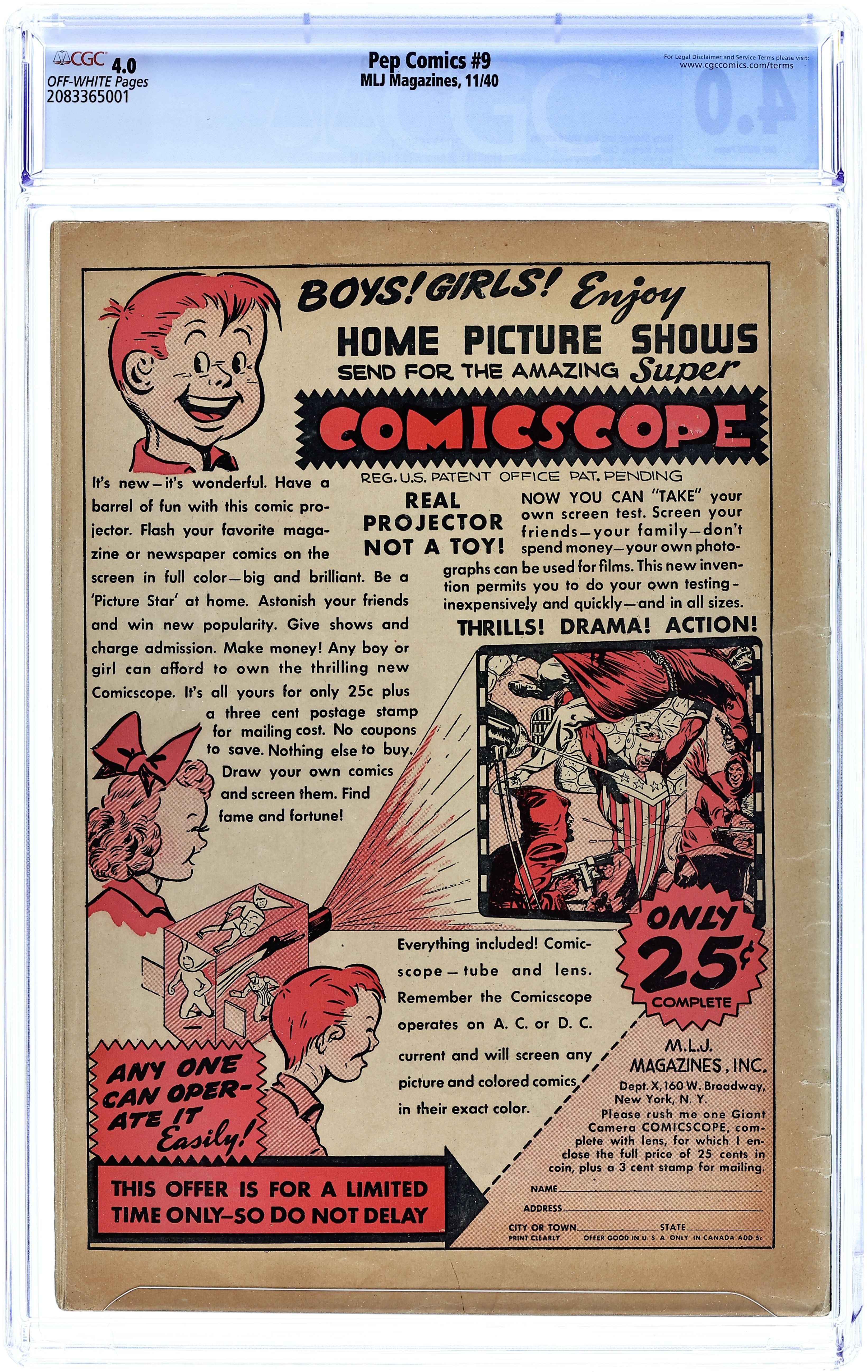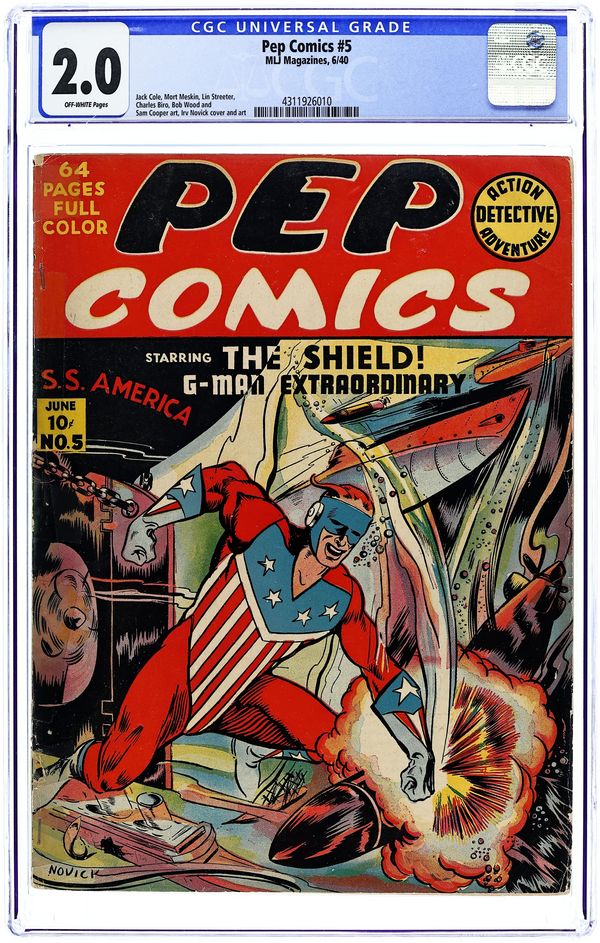 Cover art by Irv Novick. Shield G-Man Club house ad. Untitled story, art by Irv Novick; Joe Higgins has a dream, which he treats as a premonition, in which a series of events lead up to the death of his partner, Dusty. "The Walrus's Prison Break," script by Harry Stein (as Steyne), art by Harry Lucey; The Walrus breaks out of prison. Shield-Wizard No. 6 house ad. "The Boogy-Woogy Balloon," script by Harry Shorten, art by Lin Streeter; The Boogies and the Woogies build a hot air balloon so that Danny and his friends can return to Wonderland. "Battle in Tobruk," art by Carl Hubbell; Low on supplies, Sgt. Boyle manages to fend off the Italian soldiers at Tobruk until supplies can arrive. "Radio-Free Germany," script by Joe Blair, art by Ed Smalle; Jolly Roger is captured by the Gestapo as he delivers radios to the Free German Movement. "Archie's Taxi Service," script and art by Bob Montana; Archie's jalopy is costing too much, so Archie offers to make it a taxi service; He picks up a man at the train station and while trying to shortcut, ends up on a road to the country. "Action in San Paulo," script by Harry Shorten, art by Art Seymour; The President of San Paulo manipulates Louis Liverlip into fighting Kayo Ward. "The Case of the Poisoning Monkey," art by Paul Reinman; Bentley investigates the death of the Duke of Ashwold. Comicscope toy ad. 68 pgs., full color. Cover price $0.10.