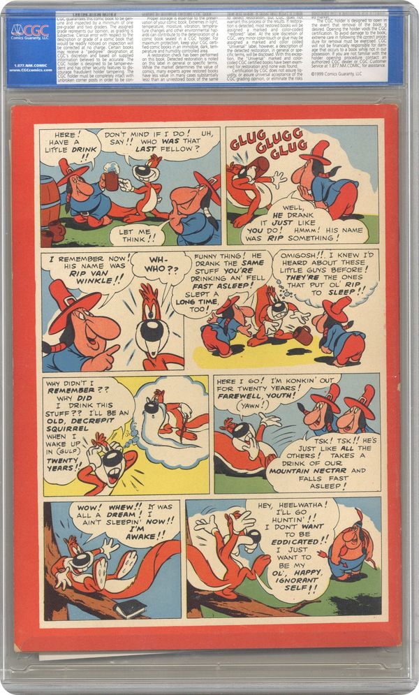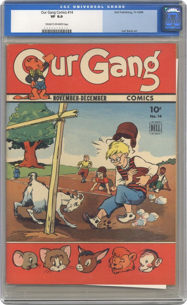Cover by Walt Kelly. Stories and art by Walt Kelly, Carl Barks, Gaylord Du Bois, Lloyd White and John Stanley. Based on the popular movie shorts also known as Little Rascals, Dell's Our Gang Comics featured early work by Pogo's Walt Kelly and other cartooning greats. In a story by Kelly, the gang accidentally runs across crooks who are counterfeiting WWII ration books. Barney Bear uses Benny Burro as bait to catch the wolf stealing his sheep, in an early story by legendary Uncle Scrooge creator Carl Barks. Jerry and Tuffy decide to go fishing in the goldfish bowl, in a story by John Stanley of Little Lulu fame. Plus a comics story featuring another Tex Avery creation, Skrewy Squirrel. Our Gang; Flip 'n' Dip; Tom and Jerry; Johnny Mole; Barney Bear and Benny Burro; Friends Indeed; Skrewy Squirrel. 48 pages, Full Color. Cover price $0.10.