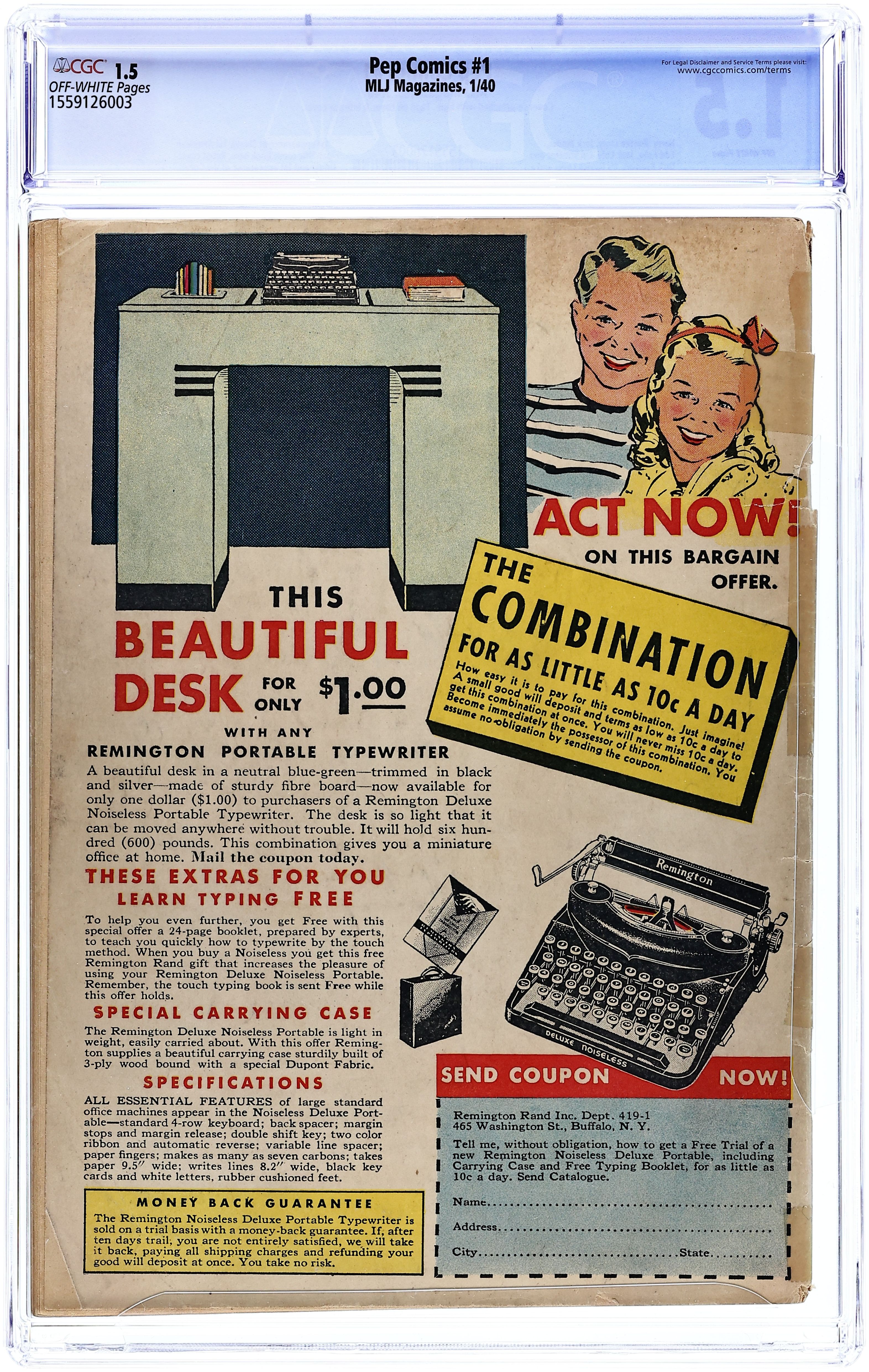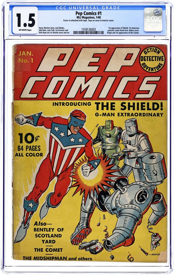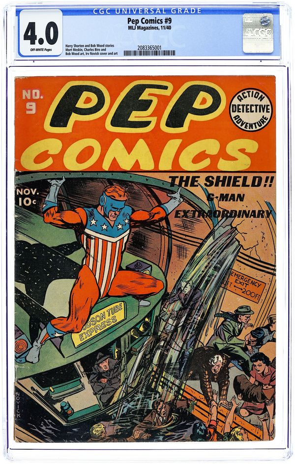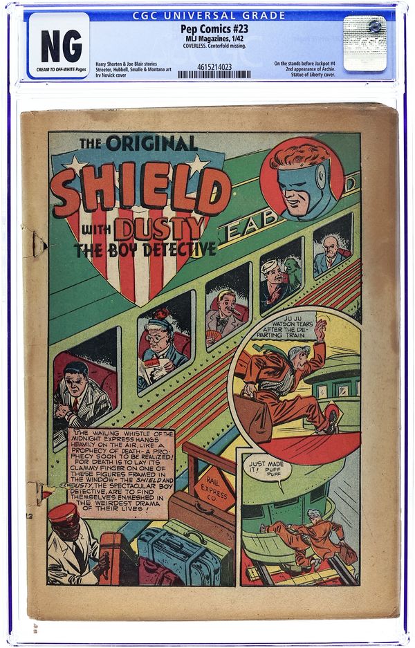 First appearance of Archie, Betty and Jughead. Cover art by Irv Novick. Shield story, script by Harry Shorten, art by Irv Novick. Hangman story, script by Joe Blair, art by Paul Reinman. Danny In Wonderland story, script by Harry Shorten, art by Lin Streeter. Sergeant Boyle story, art by Carl Hubbel. Jolly Roger story, script by Joe Blair, art by Ed Smalle. Introduction and first appearance of Archie Andrews, script by Vic Bloom, art by Bob Montana. Kayo Ward story, script by Harry Shorten. Bentley of Scotland Yard story, script by Joe Blair. 68 pgs. $0.10. Cover price $0.10.