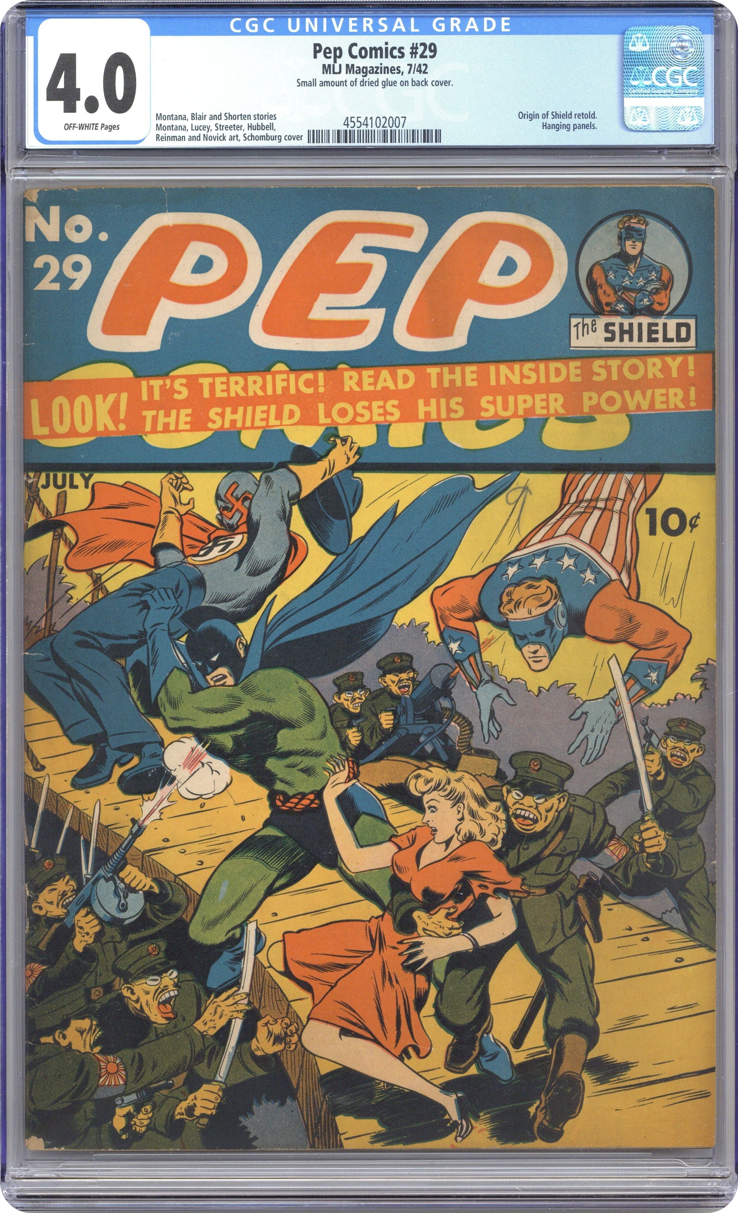 Cover art by Bob Montana. The Ghost Goes East starring the Shield, art by Irv Novick. The Hangman and the Snail, art by Bob Fujitani. Li'l Chief Bugaboo story, art by Higgins. Catfish Joe story, script and art by Larry Harris. Archie the Pug, script by Ed Goggin, art by Harry Sahle. Marco Loco story, script by Ed Goggin, art by Harry Sahle. Heroes Never Die starring Captain Commando, art by Irv Novick. 60 pgs. $0.10. Cover price $0.10.