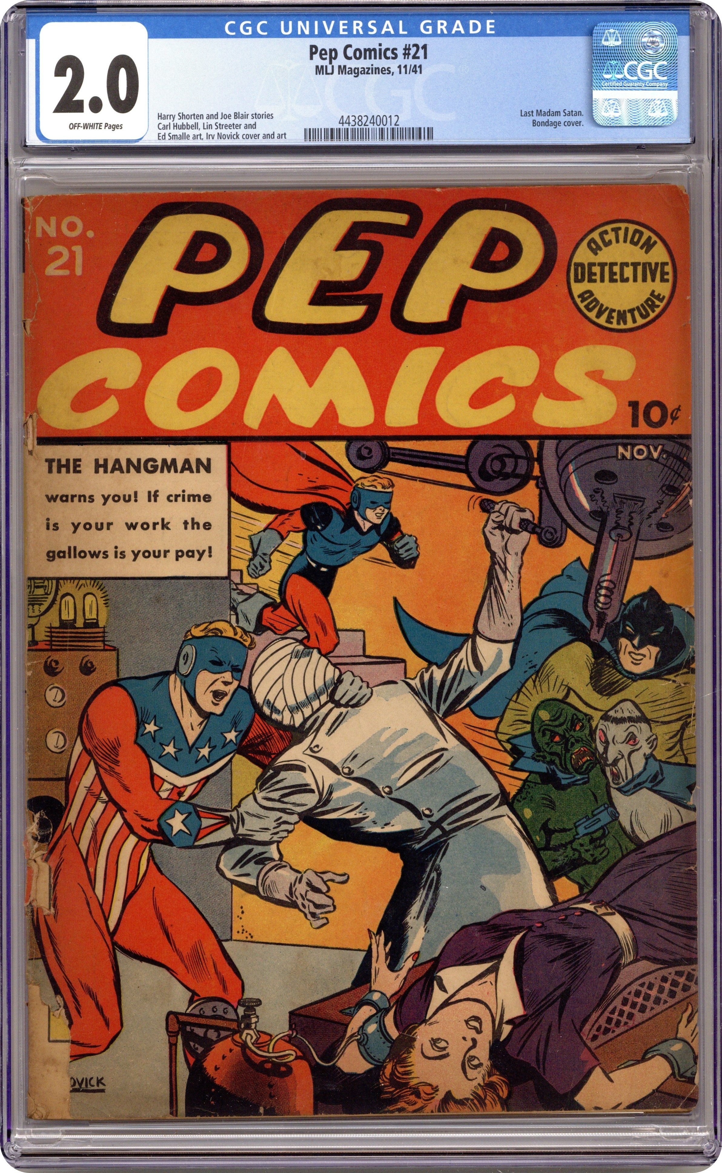 Cover art by Irv Novick. Shield story, script by Harry Shorten, art by Irv Novick. Hangman story, script by Joe Blair. Danny In Wonderland story, script by Harry Shorten, art by Lin Streeter. Sergeant Boyle story, art by Carl Hubbell. Jolly Roger story, script by Joe Blair, art by Ed Smalle. Madam Satan story, art by Harry Lucey. Kayo Ward story, script by Harry Shorten. Bentley of Scotland Yard story, script by Joe Blair. 68 pages. Cover price $0.10.